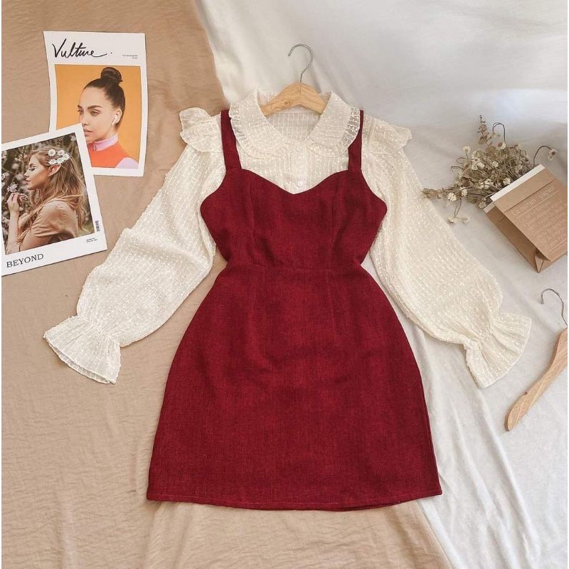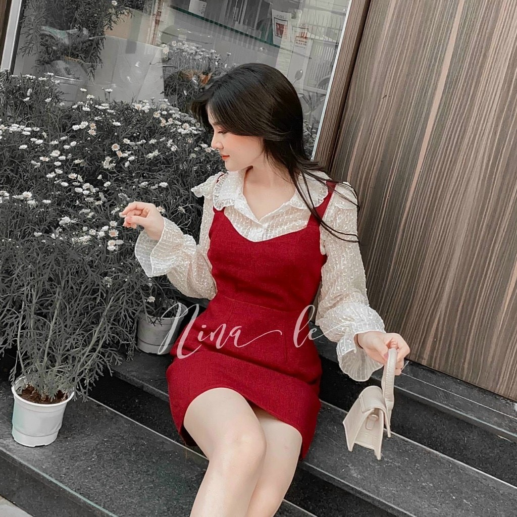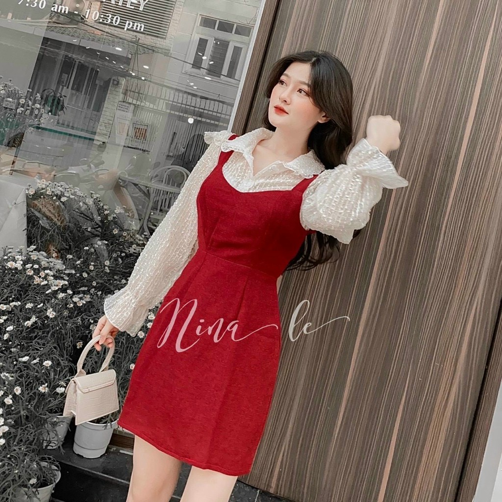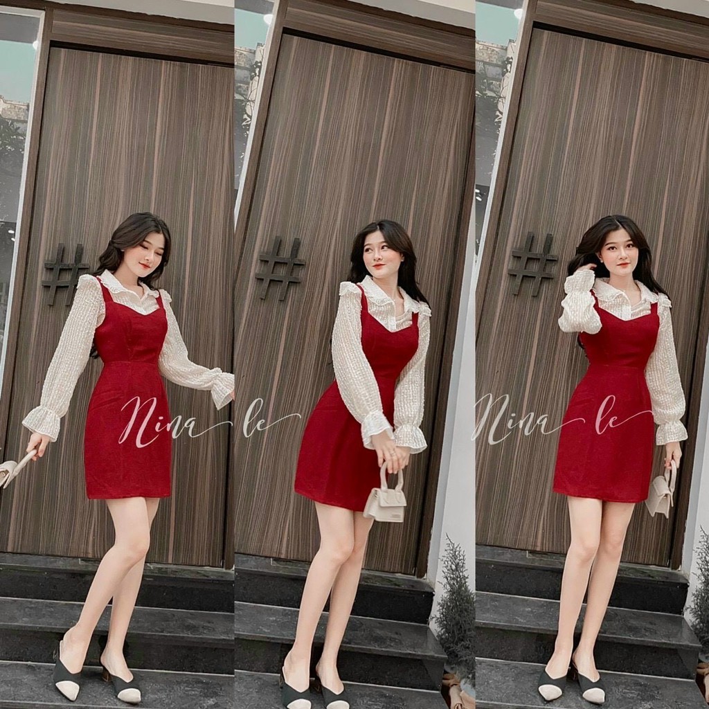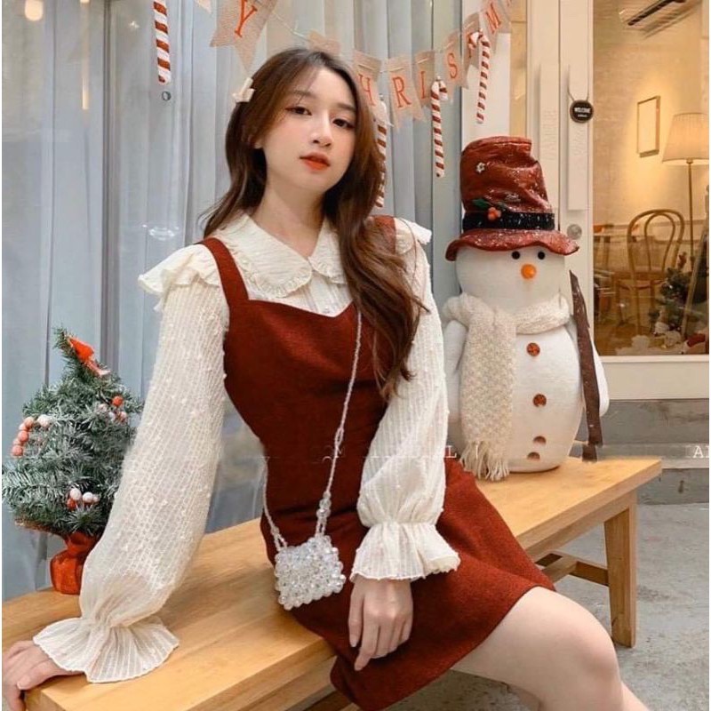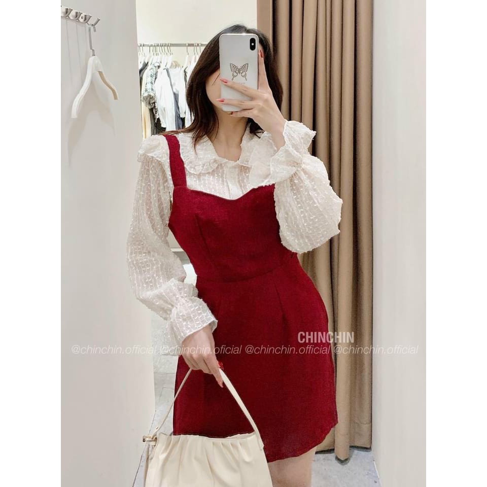 |Có Ảnh Thật| Set Áo Tay Dài Cổ Tim + Yếm Chất Dạ Đỏ Siêu Sang