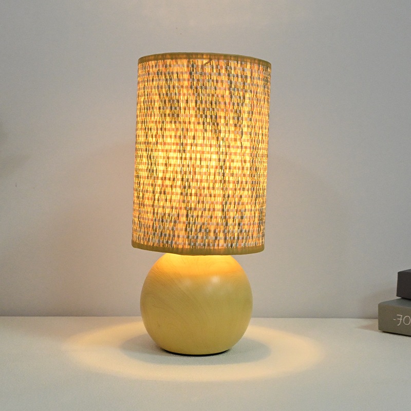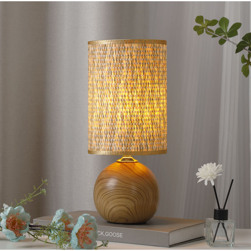 Đèn bàn gốm hạt gỗ cổ điển có tấm che đèn vải dệt tay, Đèn bàn có thể điều chỉnh độ sáng ba màu cắm, Phòng ngủ Phòng khách Đèn ngủ học tập