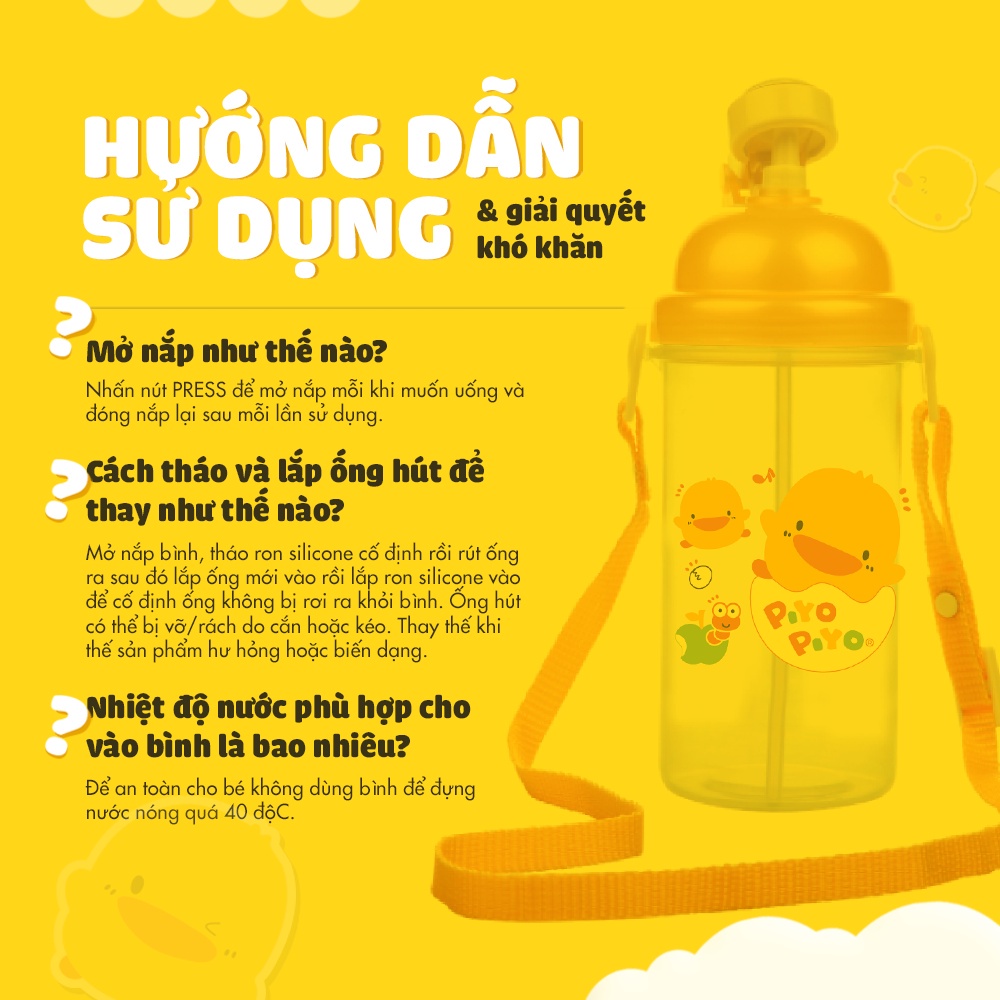 Bình Nước Cho Bé Đi Học Hoặc Tập Uống Có Dây Đeo Piyo Piyo 500ml- Chống Sặc, Ngăn Tràn