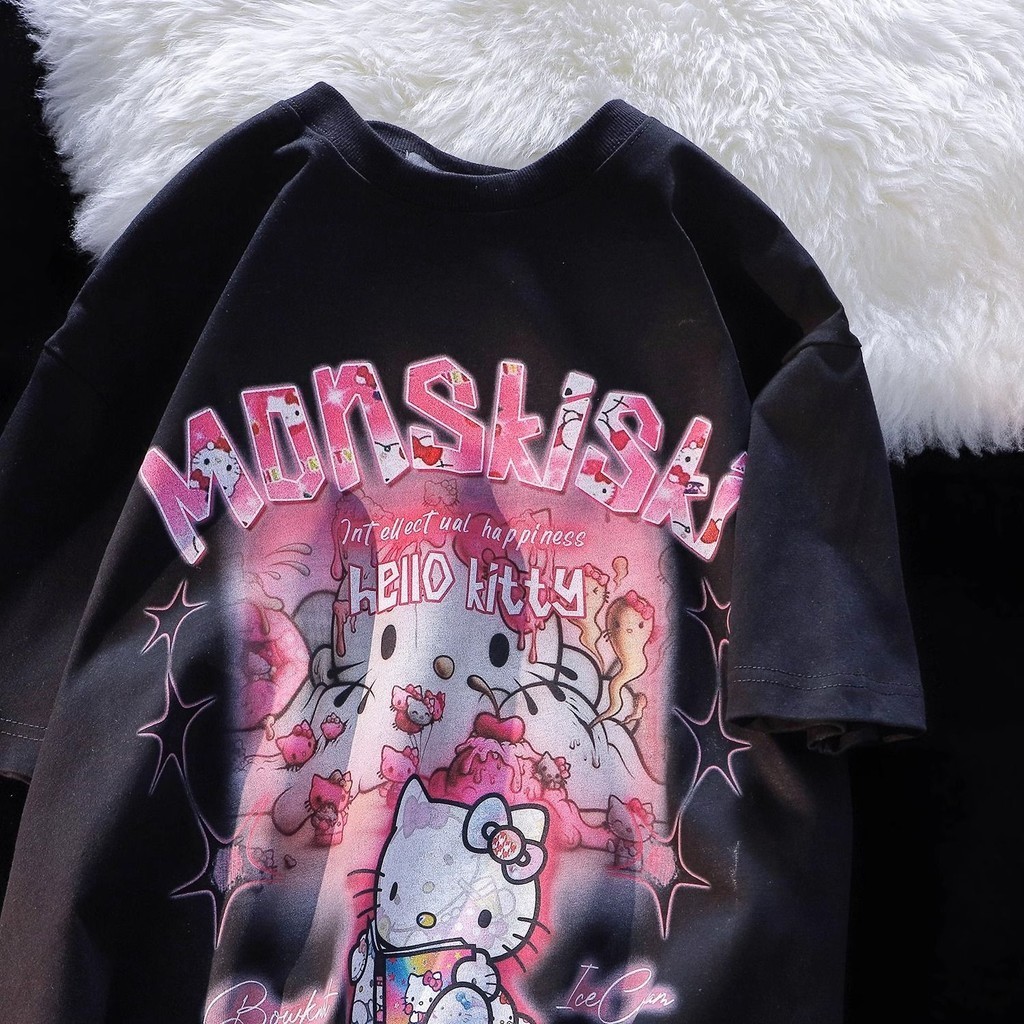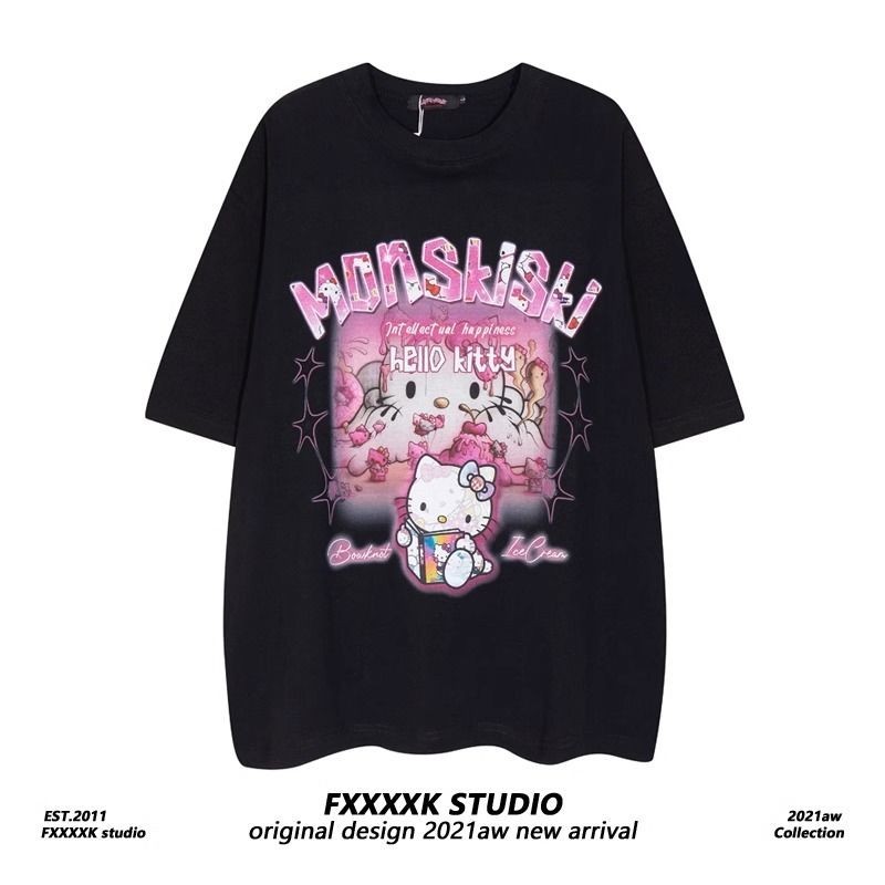 Nặng Nguyên Chất Cotton Mỹ Ngọt Ngào Dễ Thương Hello Kitty In Hình Áo Thun Ngắn Tay Nam Nữ Rời Retro Cặp Đôi Hàng Đầu Hợp Thời Trang