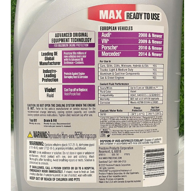[ HÀNG CHÍNH HÃNG ] Nước Làm Mát Động Cơ Prestone MAX màu TÍM dành cho xe Châu Âu (3.78 lít)