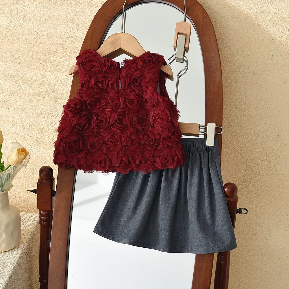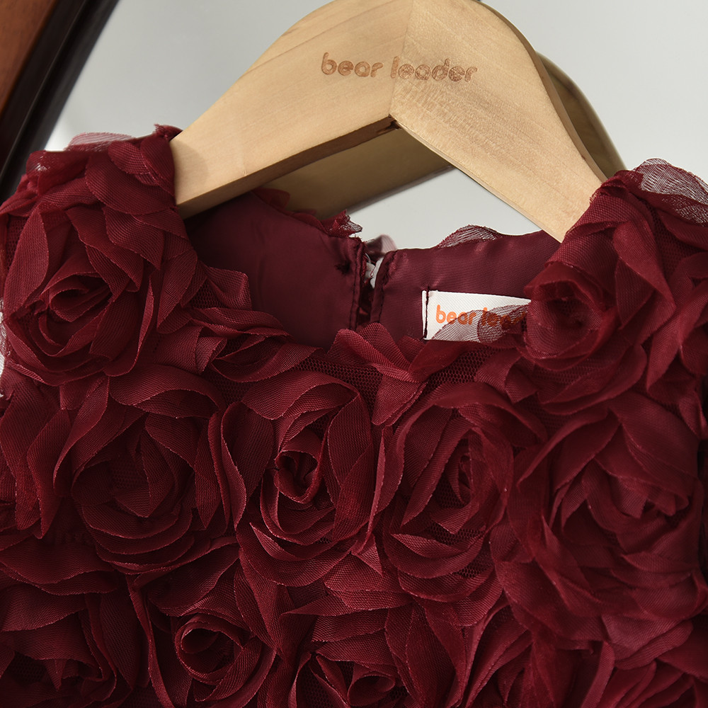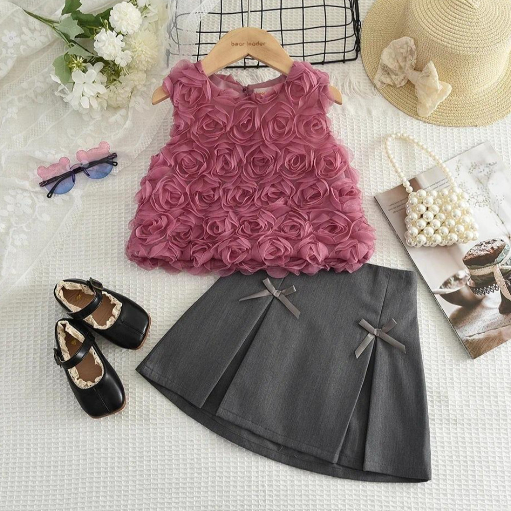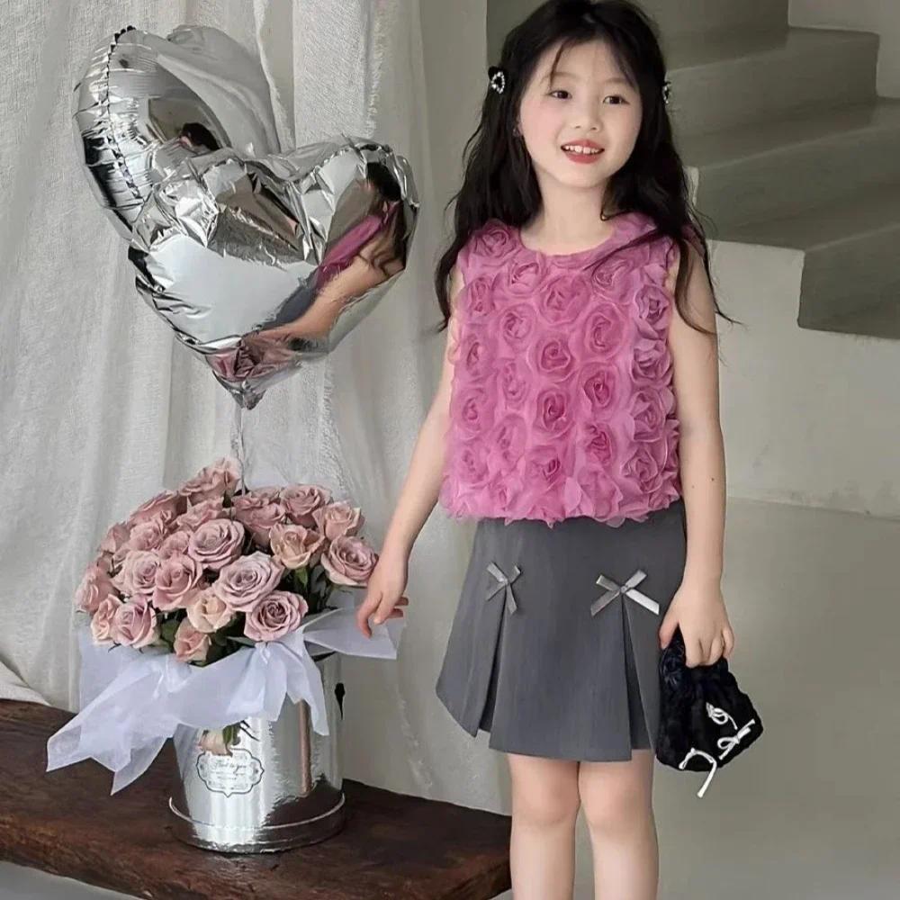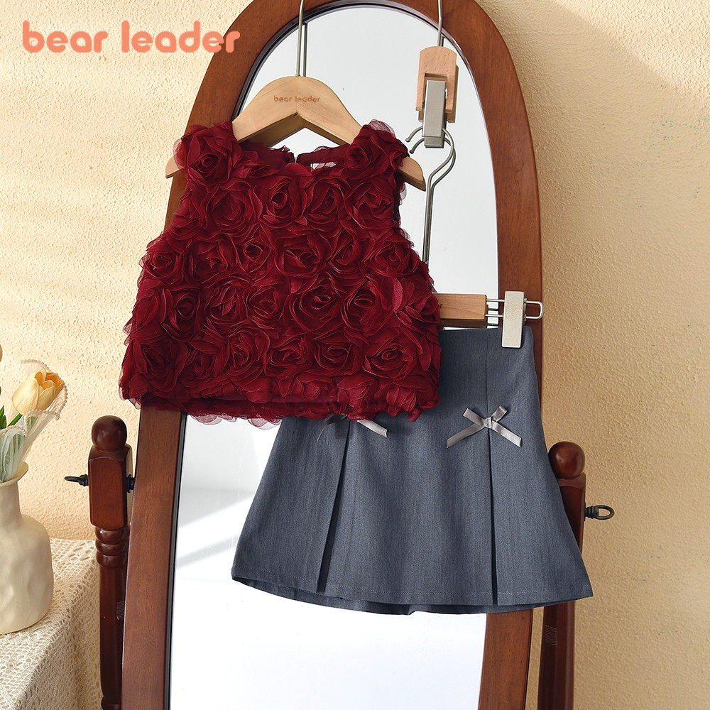 Bear Leader Phiên bản Hàn Quốc Áo không tay ren hoa 3D + Váy xếp li nơ Bộ hai mảnh mùa hè Màu trơn mới Phong cách đại học Quần áo bé gái Năm mới và Giáng sinh