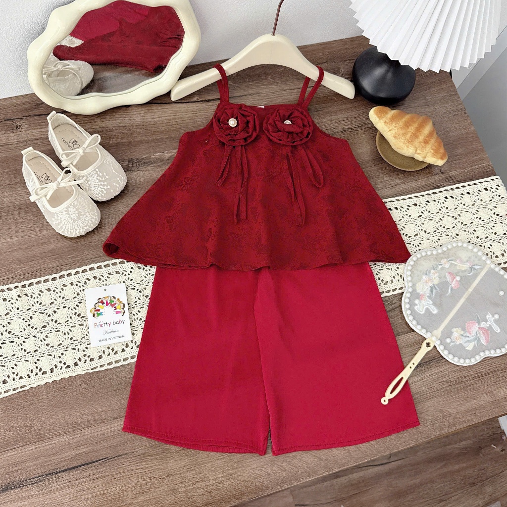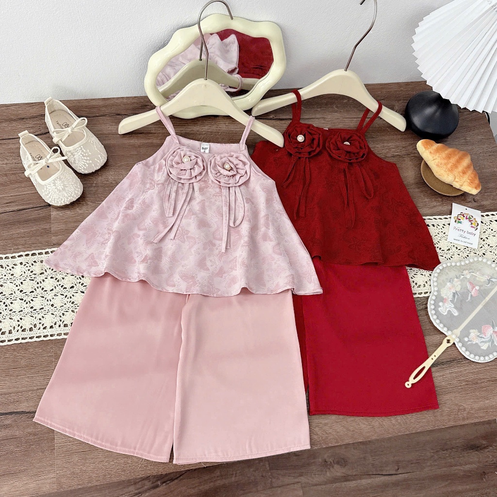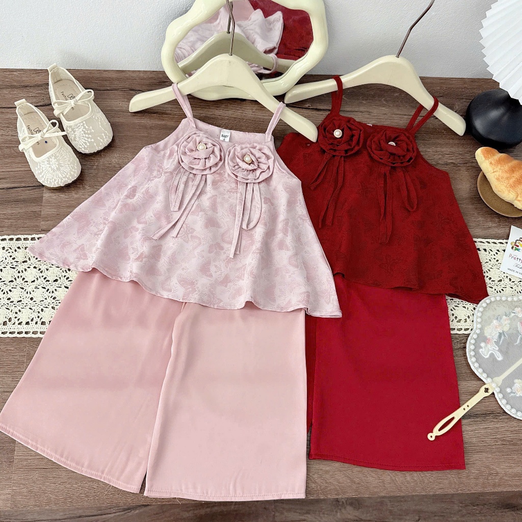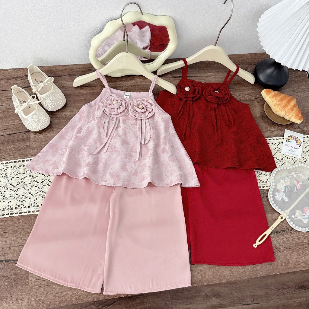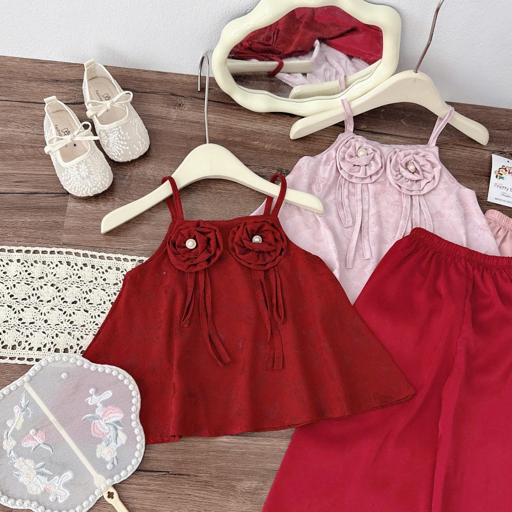 TT03 Sét bộ trung thu bé gái quần lụa hoa mầu sắc hồng đỏ cho bé gái dễ thương size 8-28kg
