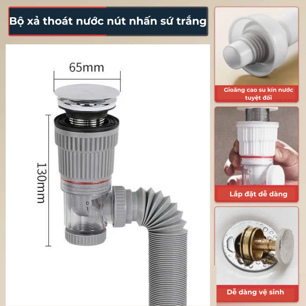 Xi phông nút nhấn sứ, ống thoát nước chậu rửa mặt, lavabo đa năng, ngăn mùi (Chậu có thoát tràn và không thoát tràn)