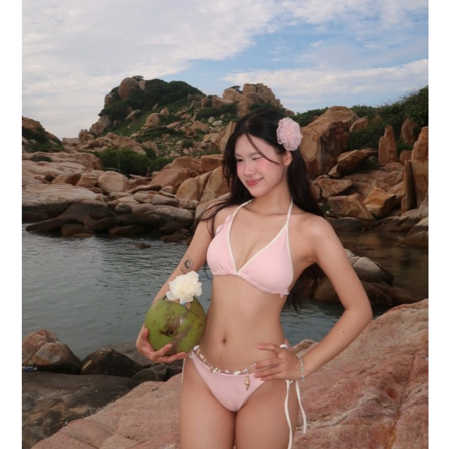 MOLLYE - CLOUDY BIKINI| (không đổi trả) Set bikini 2 mảnh màu hồng trắng pastel đính hoa kèm mút, mặc đi biển mùa hè
