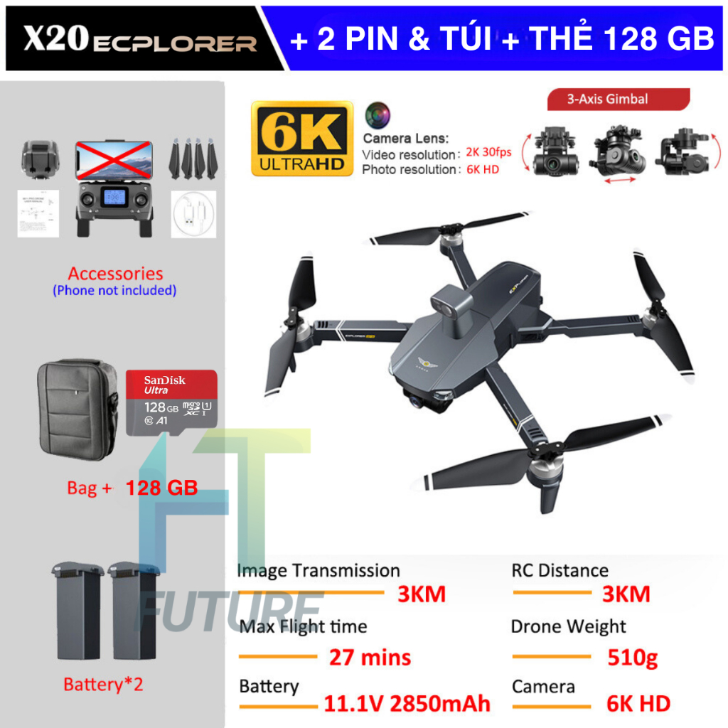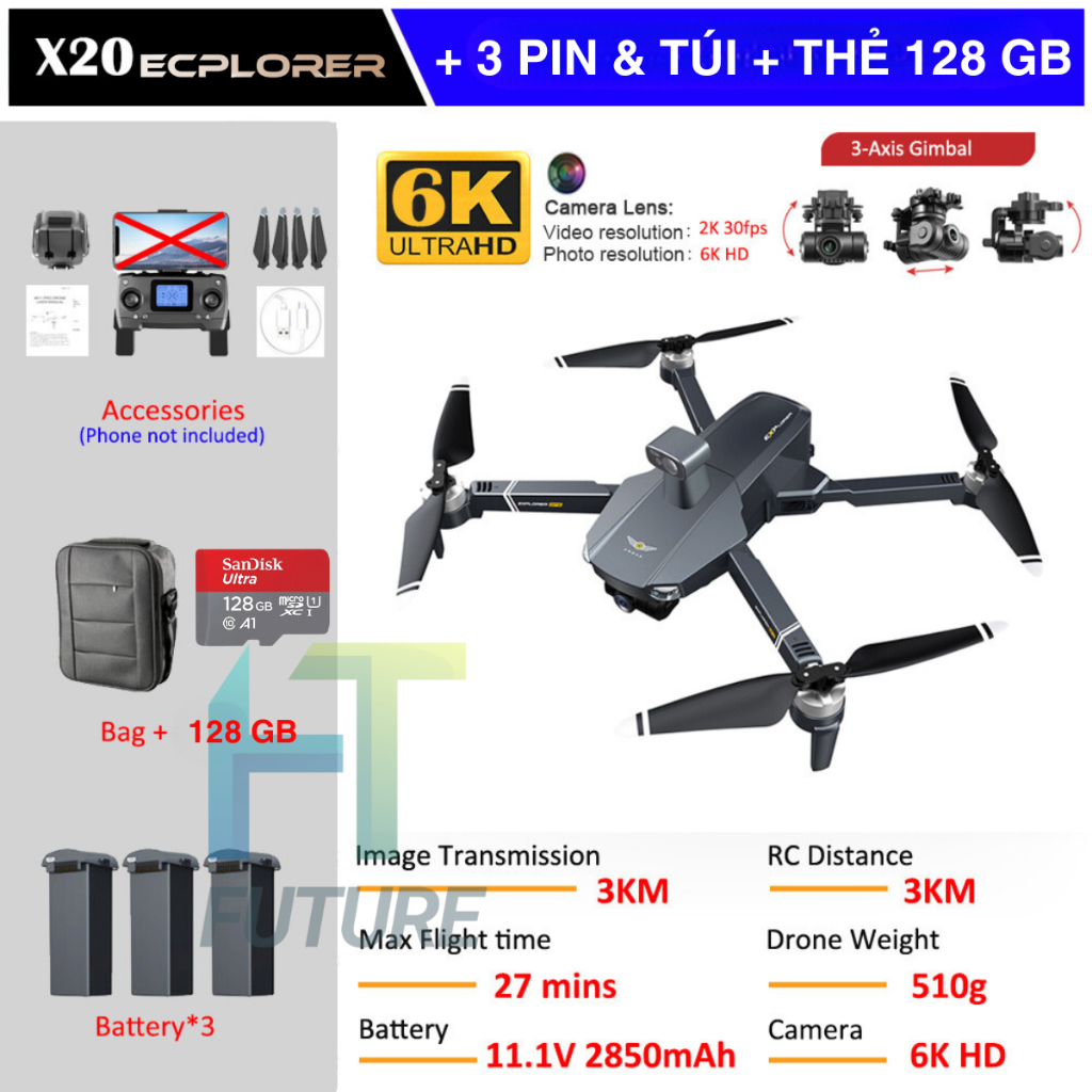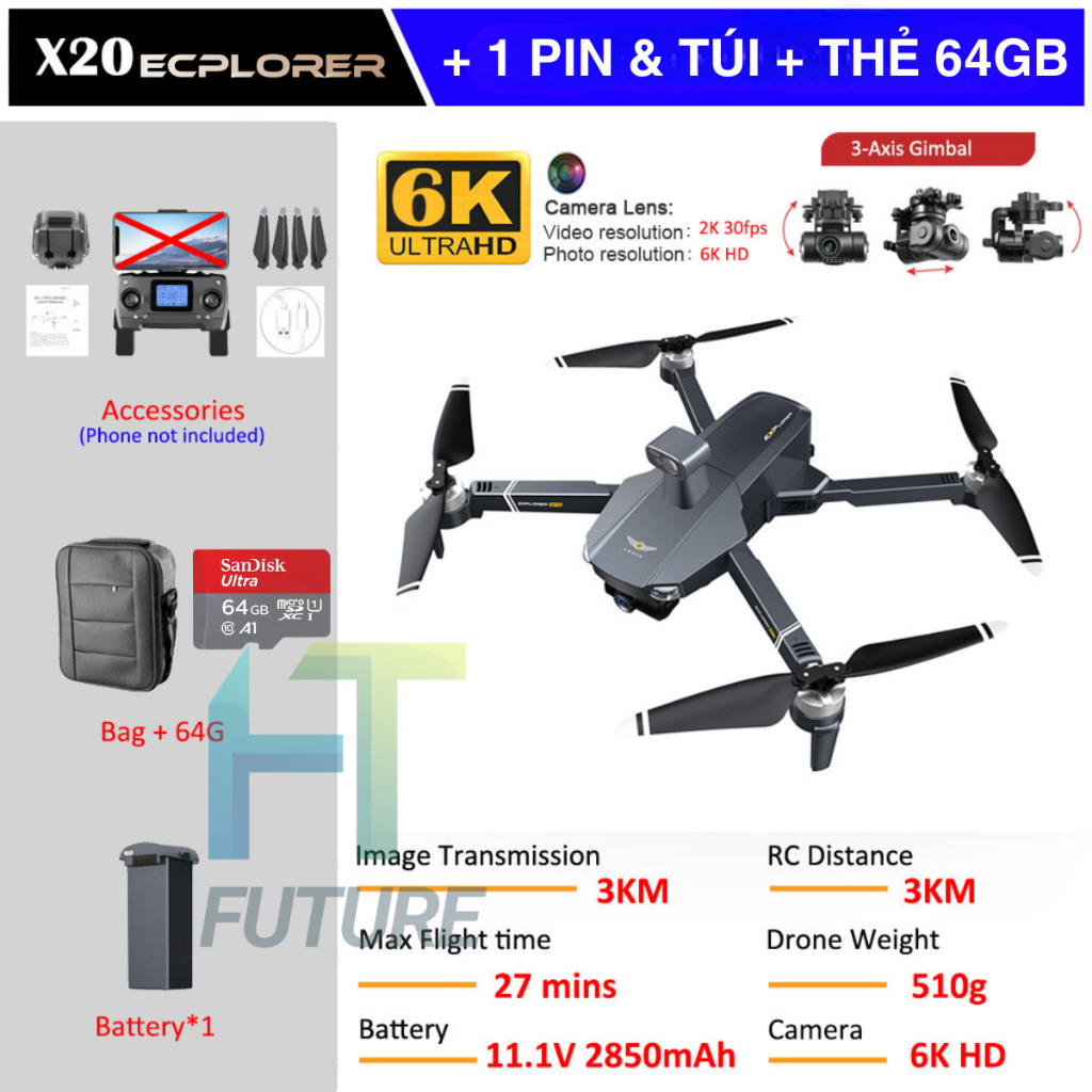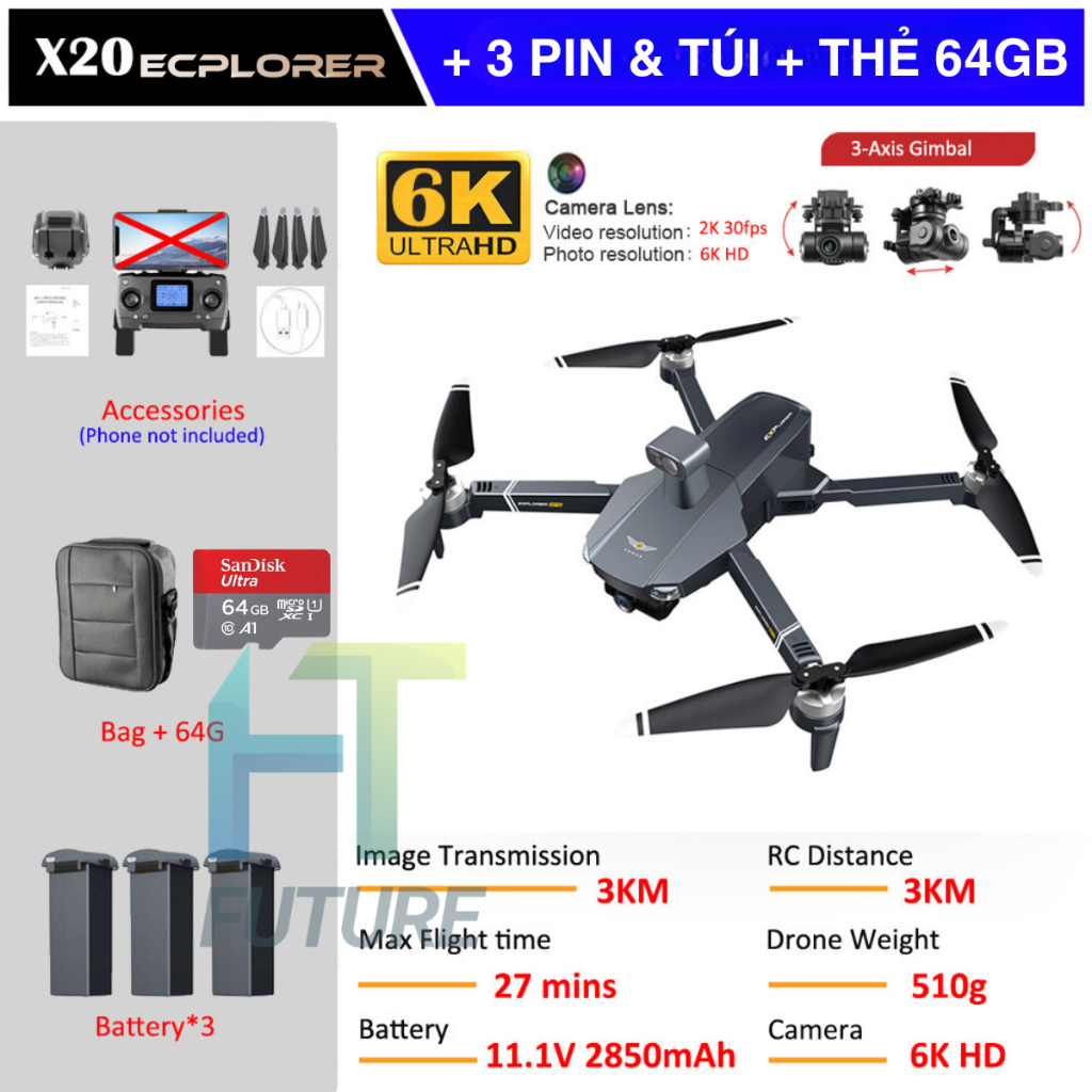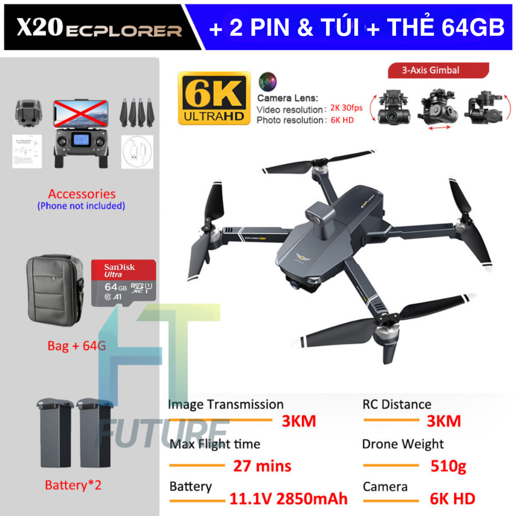 Flycam X20 – Flycam Giá Rẻ, Camera Kép 6K, Bay Lên Đến 35 Phút Định Vị GPS Kép, Pin 3000 mAh -11.1V