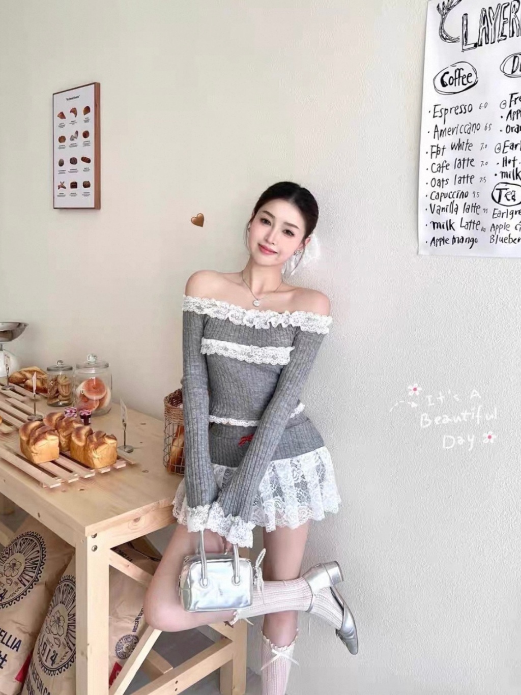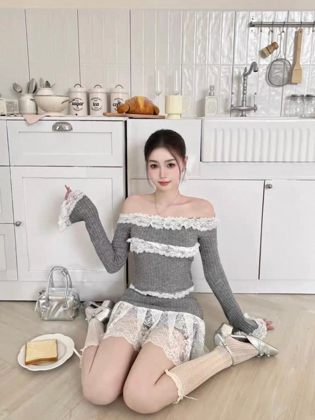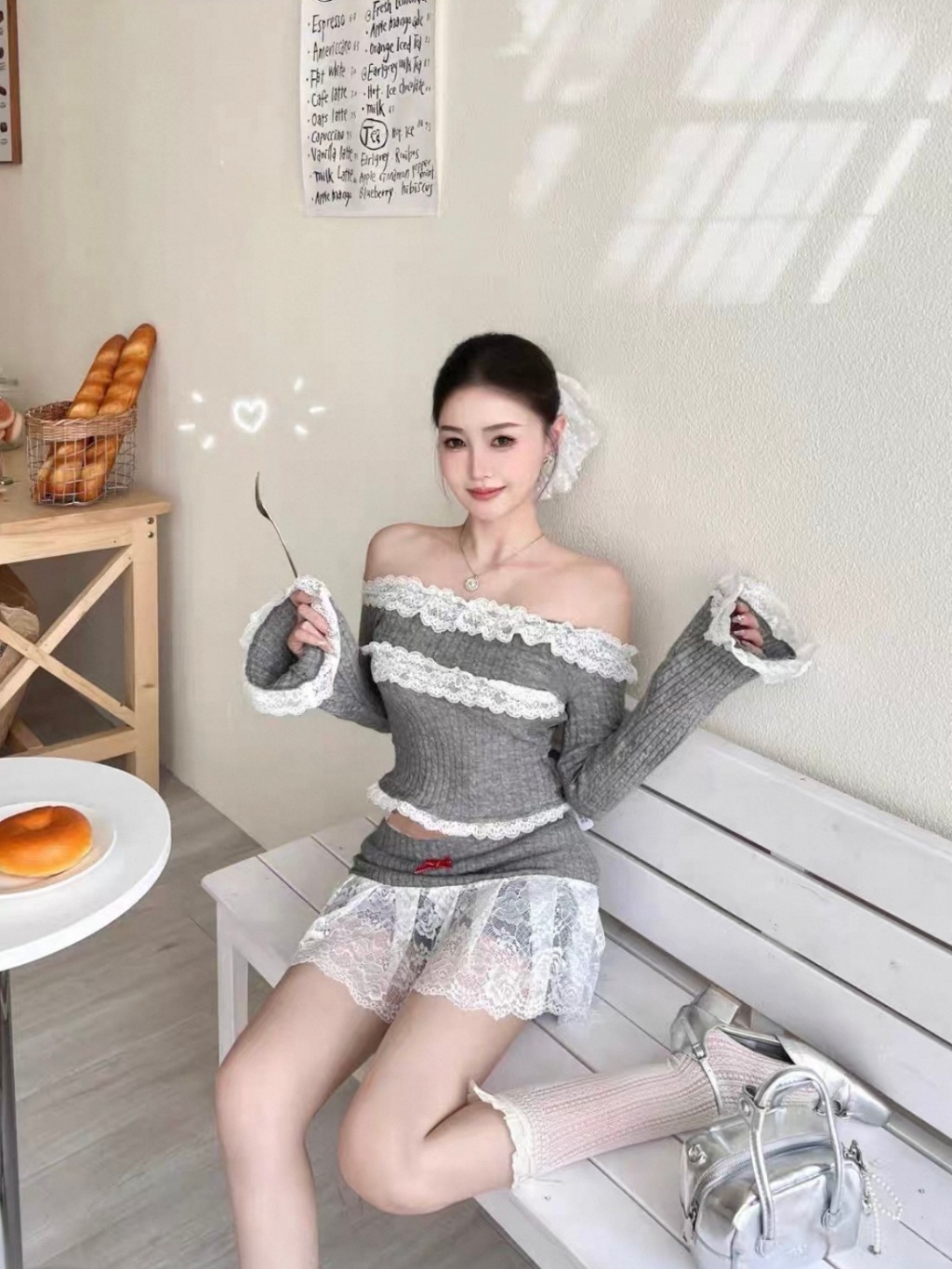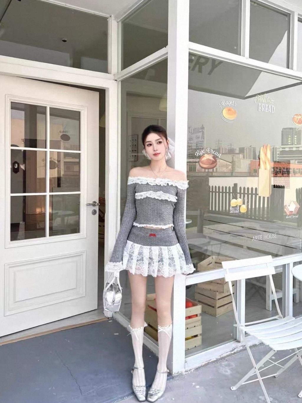 OB180 Set 2 Món Áo Trễ Vai Tay Áo Dài Loe Nhẹ Chân Váy Ngắn Viền Ren Nữ Tính Nhẹ Nhàng