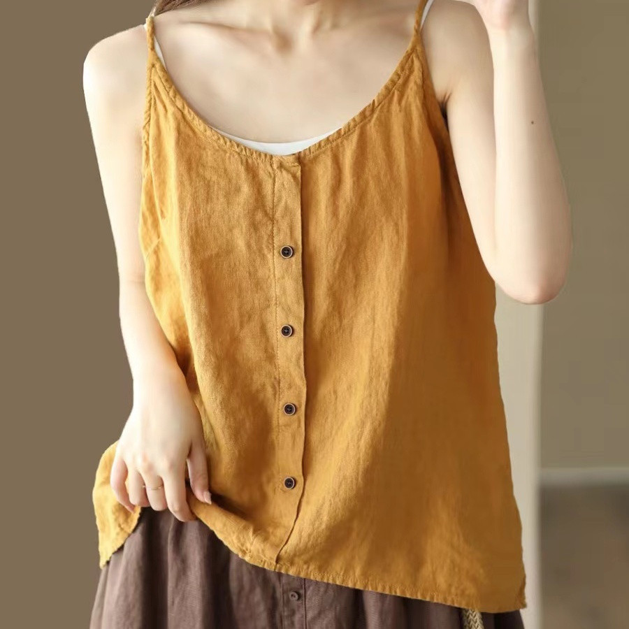 Vải Lanh Cotton Mùa Hè Phong Cách Mới Văn Học Retro Top Nút Trang Trí Mỏng Rời Bên Trong Đế Nữ