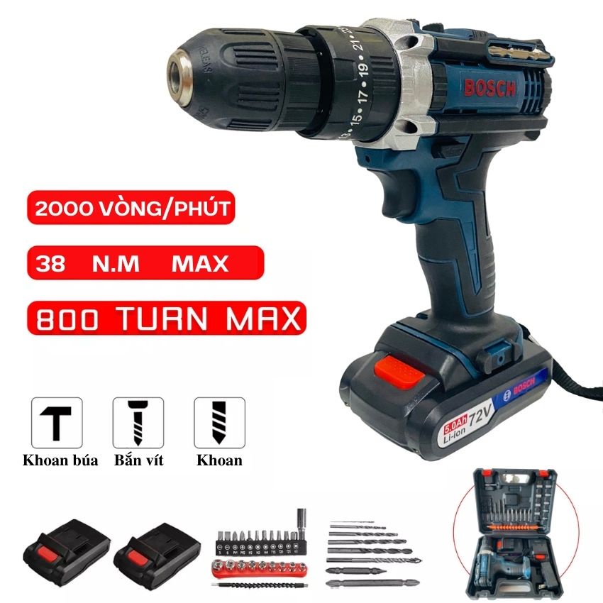 Máy khoan pin 72V Bosch 3 chức năng có búa - Tặng kèm bộ phụ kiện 24 món khoan, bắt vít