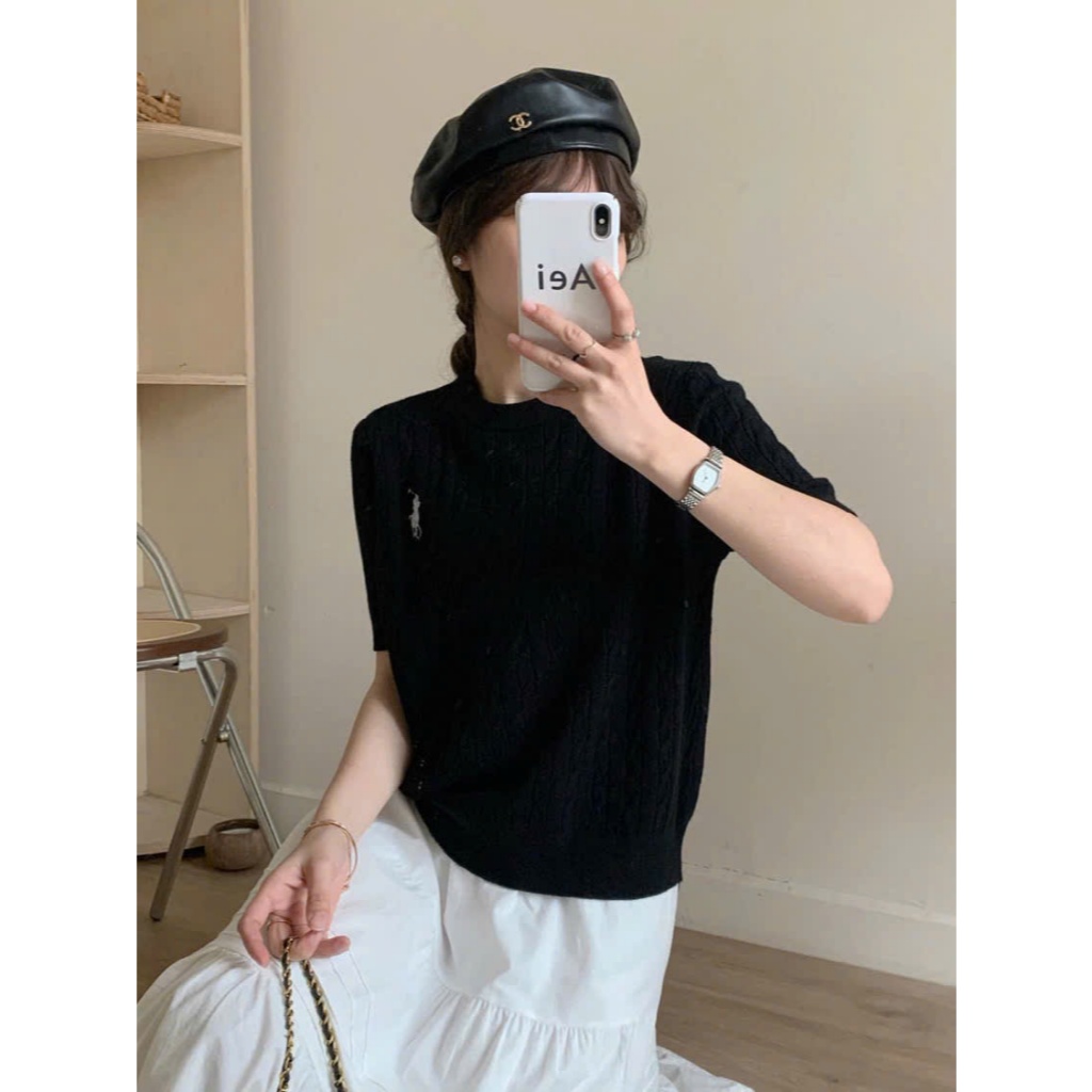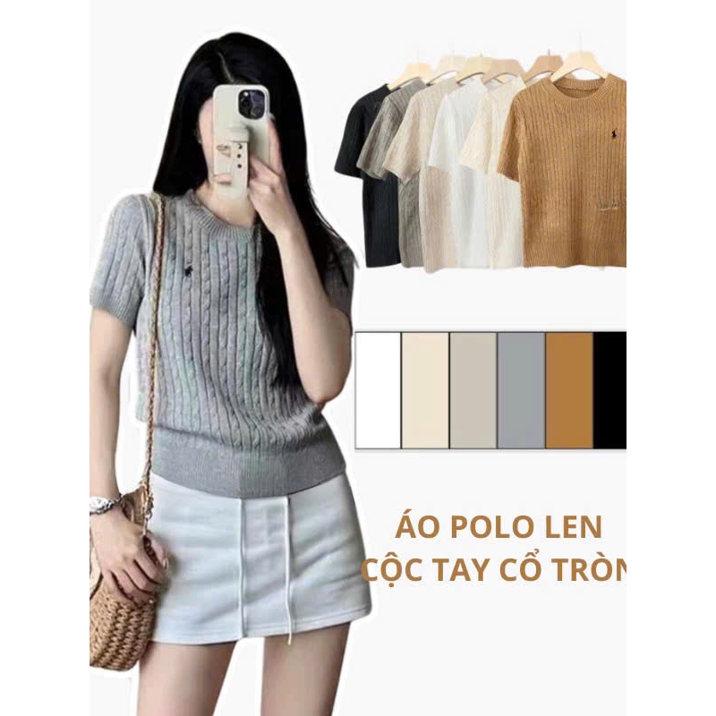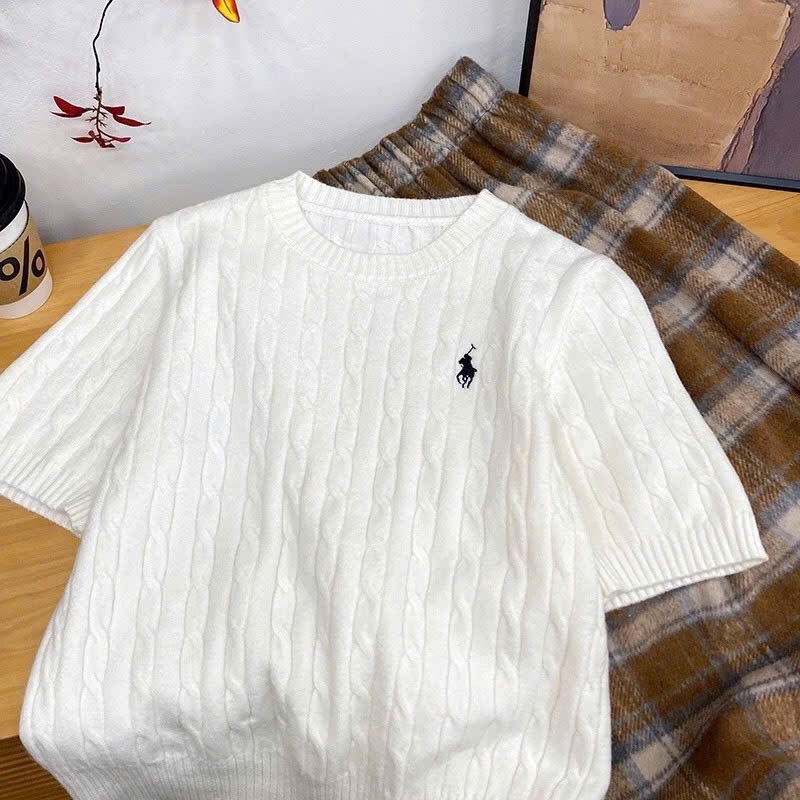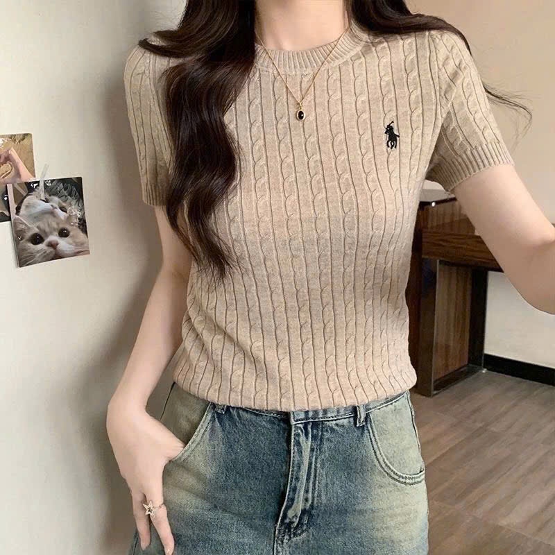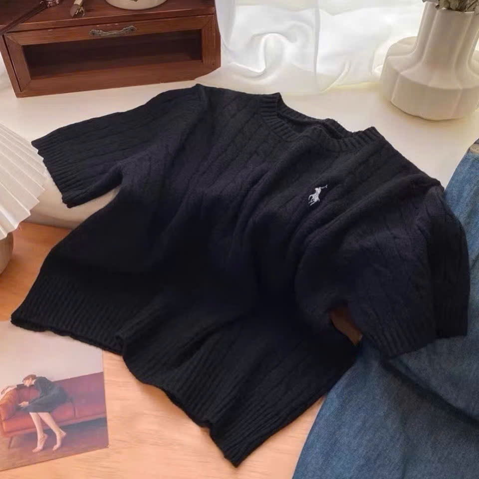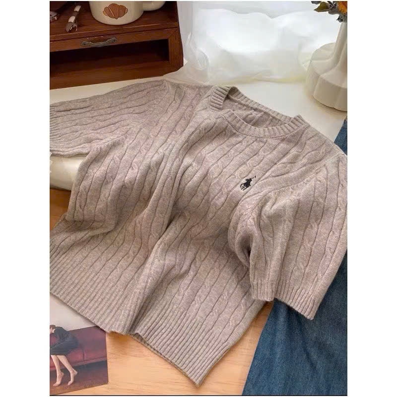 (CÓ SẴN) Áo len vặn thừng cộc tay thêu ngựa, Áo len cổ tròn xinh xắn cho nữ ALCT113