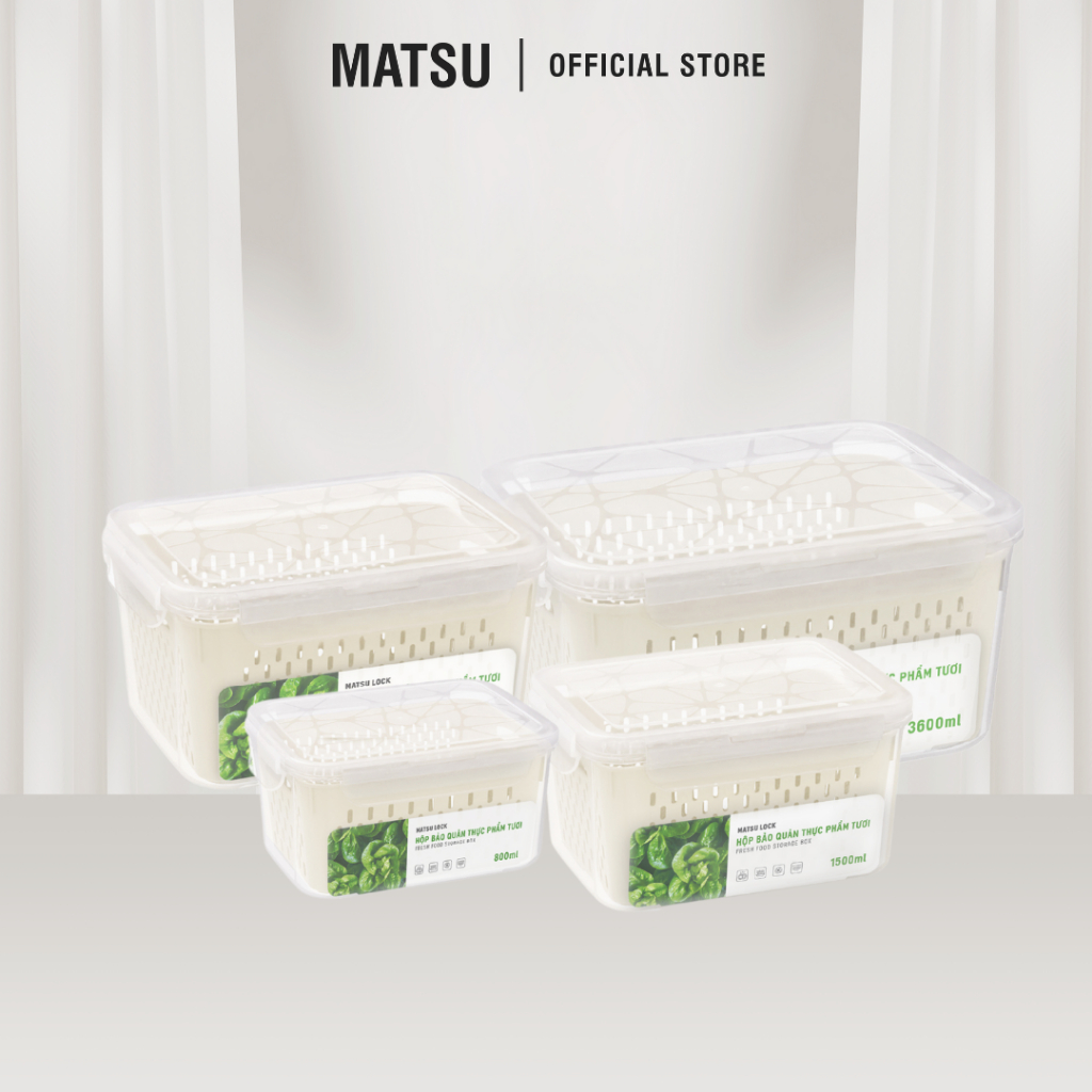 Hộp bảo quản thực phẩm tươi MATSU rổ thoát nước, nhựa PP nguyên sinh nắp silicone kín ngăn ám mùi