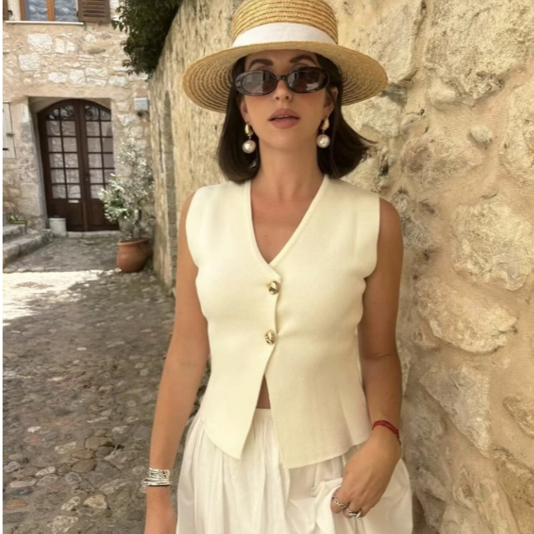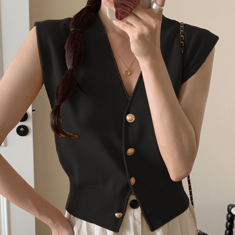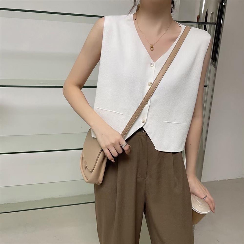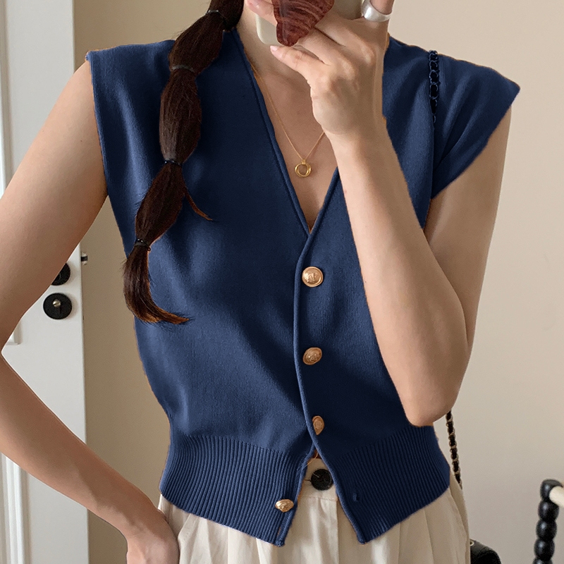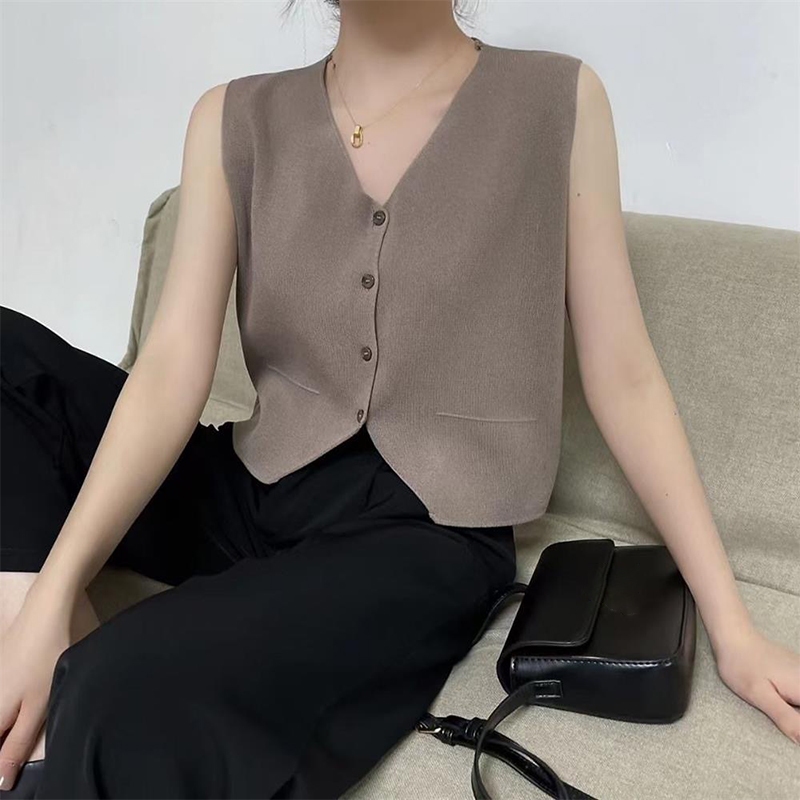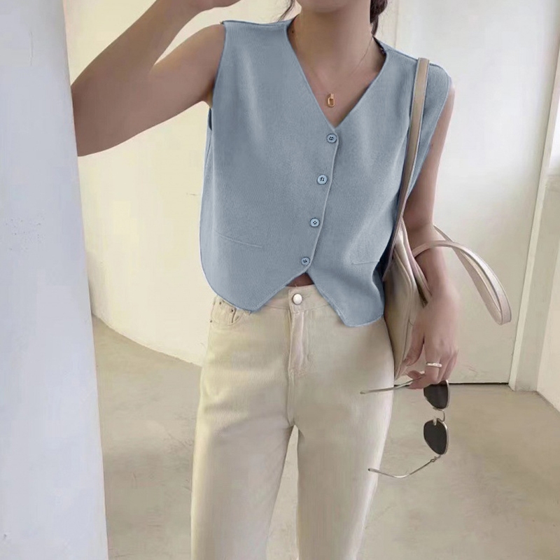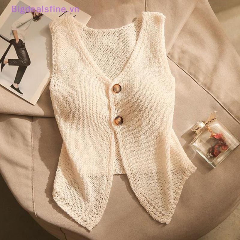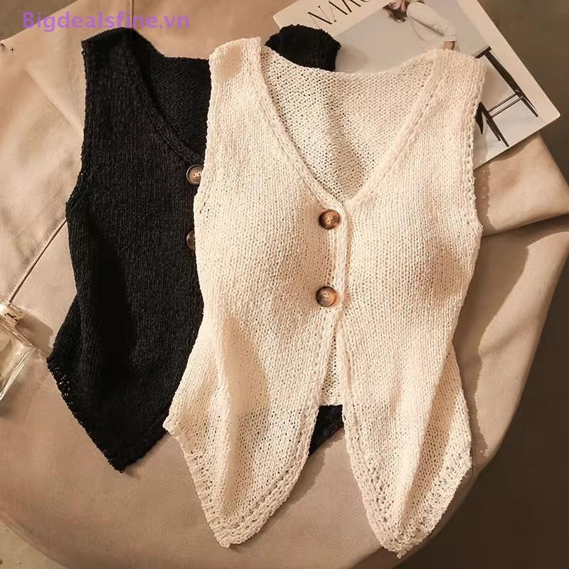 Bfvn Mùa Hè Nữ Thời Trang Màu Trơn Sang Trọng Nút Cổ Chữ V Áo Dệt Kim Không Tay HOT