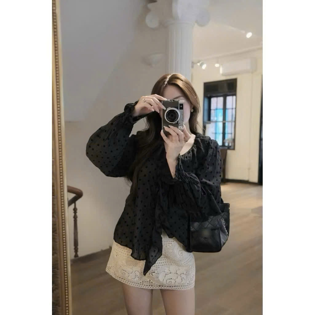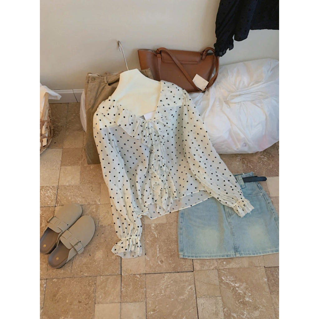 (QC Sẵn) Áo sơ mi cổ V viền bèo hoạ tiết chấm bi nhẹ nhàng Áo style Hàn chất voan mềm mát đủ màu