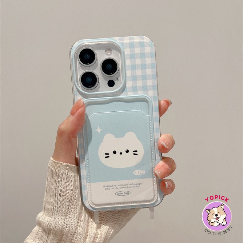 Dây đeo cổ tay mèo kẻ sọc màu xanh cho iPhone15 15promax xsmax xr 7plus 7 11pro 12 13 Vỏ điện thoại 14 11promax Hộp đựng thẻ đựng thẻ 12 Vỏ mềm Dây chuyền di động Cô gái Dễ thương Mới trong suốt GKB