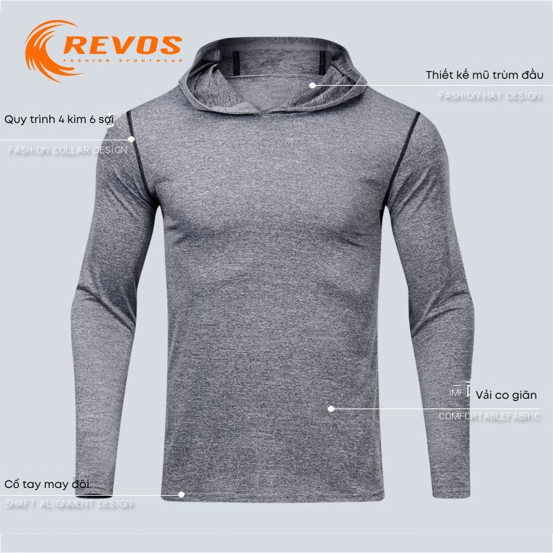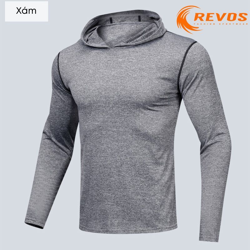 Áo thun tay dài thể thao, áo tập gym nam có mũ vải co giãn thoáng khí REVOS Áo chạy bộ nam, áo bóng rổ cao cấp KP078