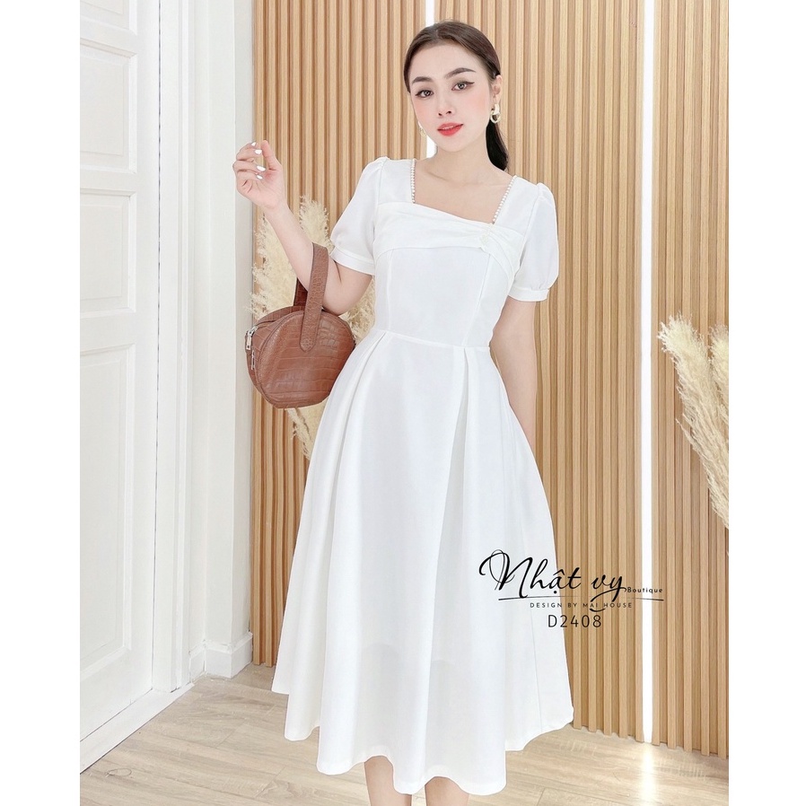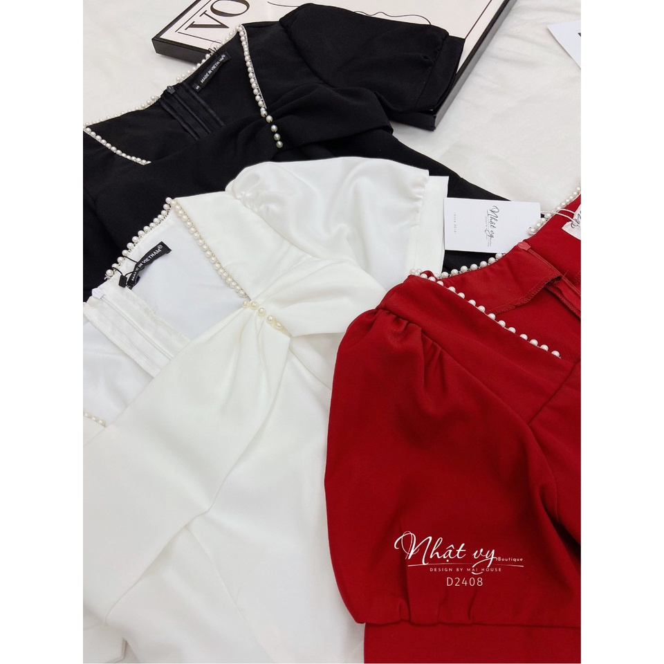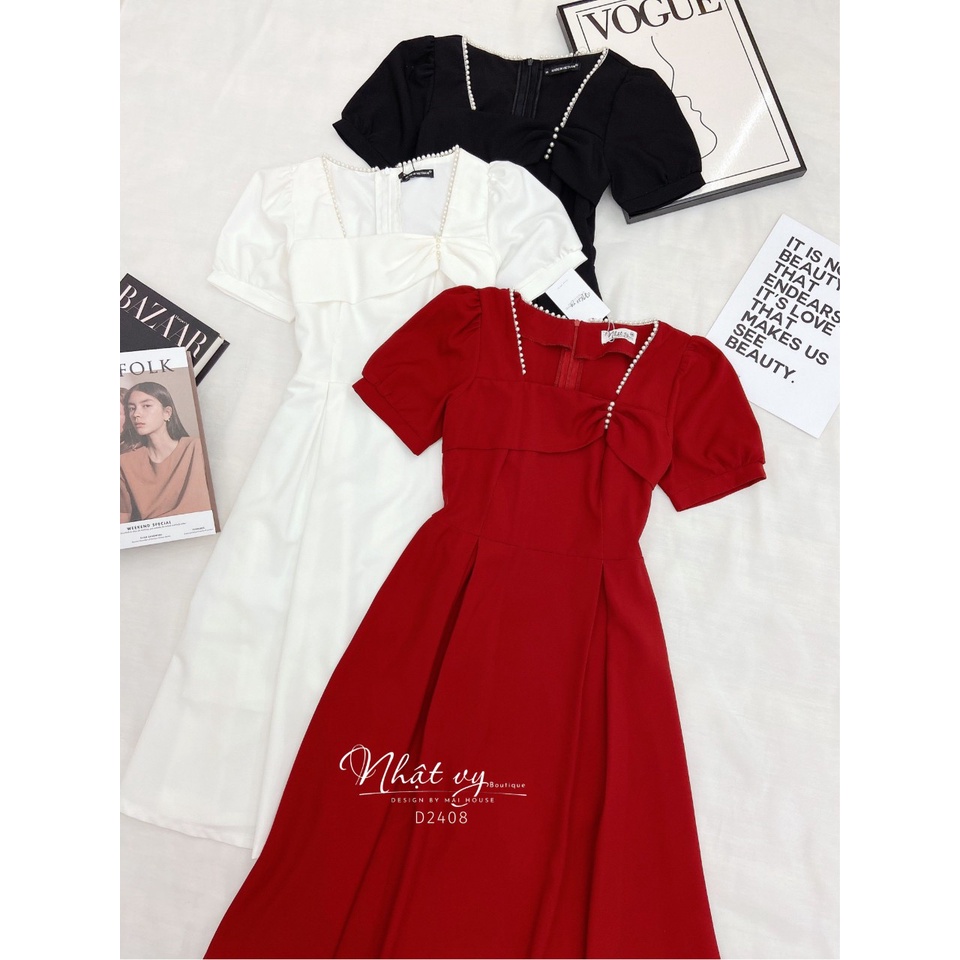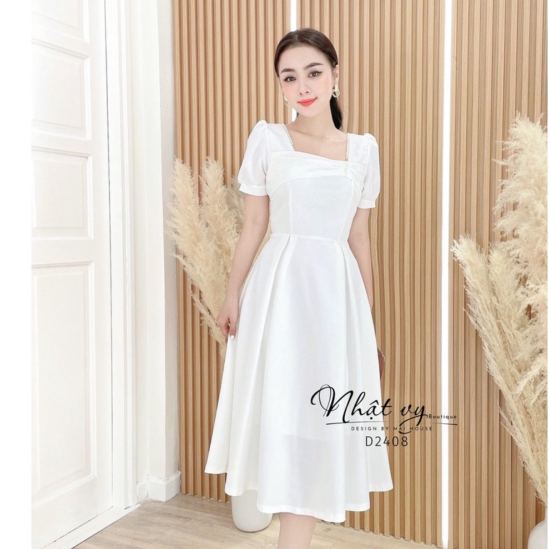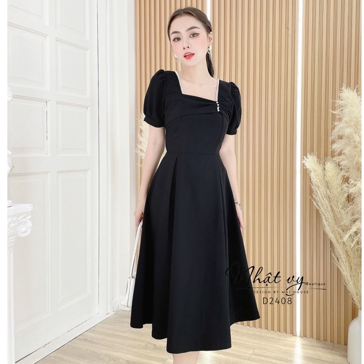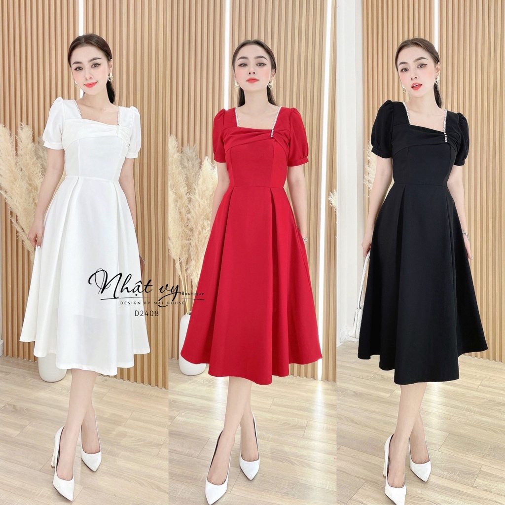 Váy Đi Tiệc NHẬT VY Nhún Ngực Cổ Vuông Tay Phồng Dáng Xoè Chất Cotton Màu Đen , Xanh , Đỏ - D2408