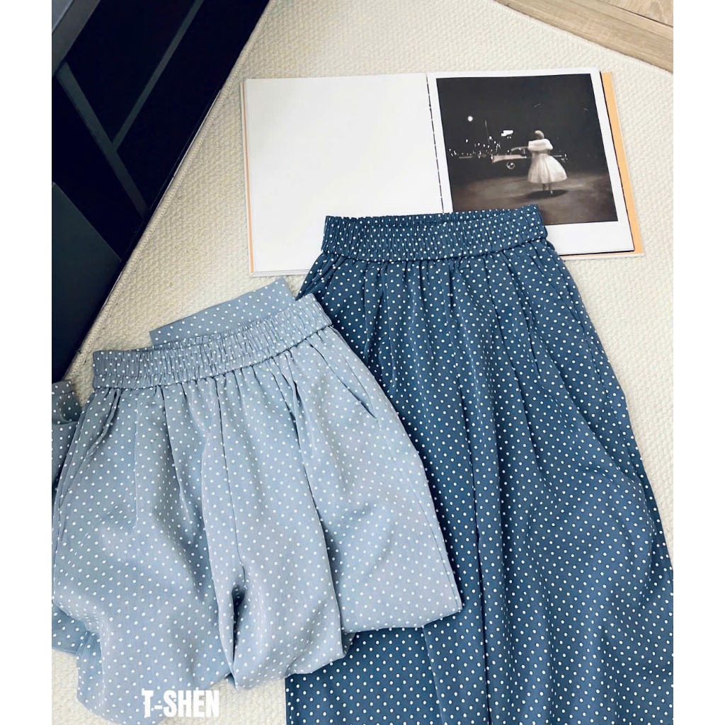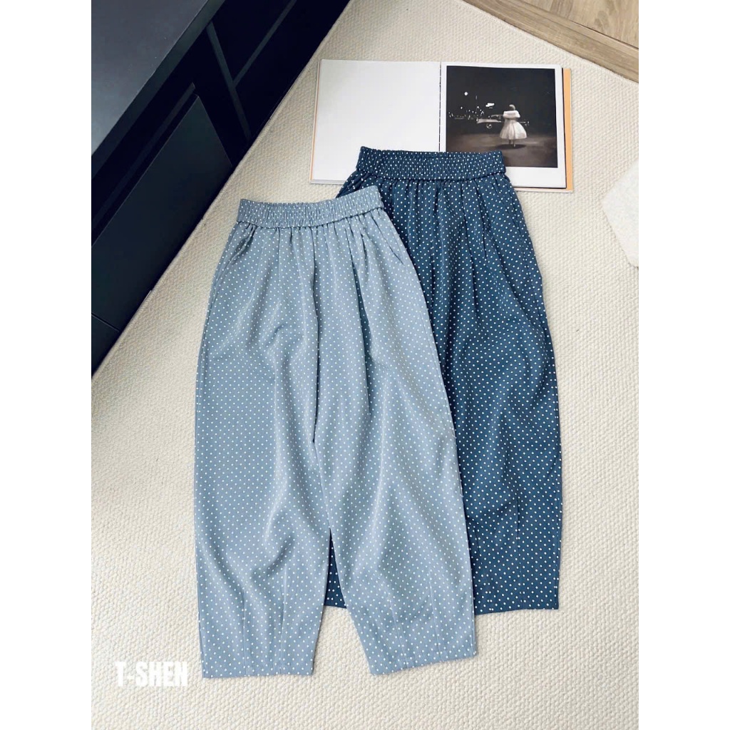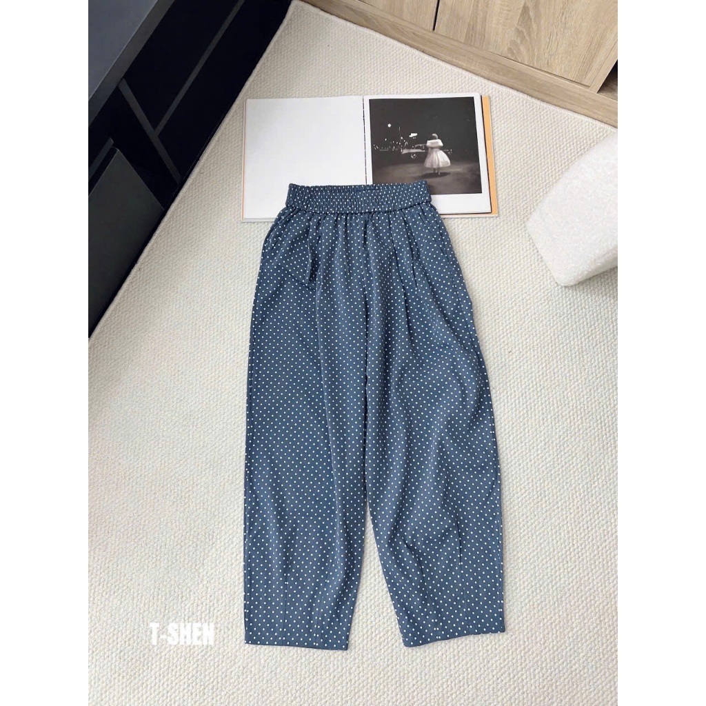 quần baggy nữ dáng bom thụng vải bò lụa hoạ tiết chấm bi cạp chun lưng cao