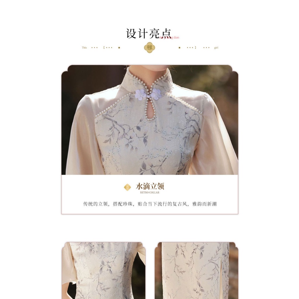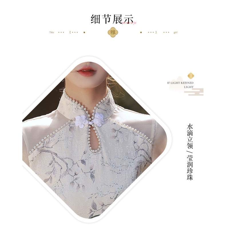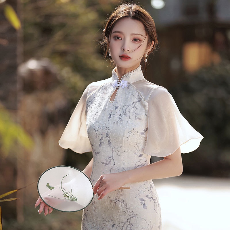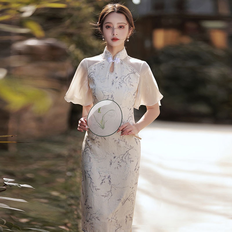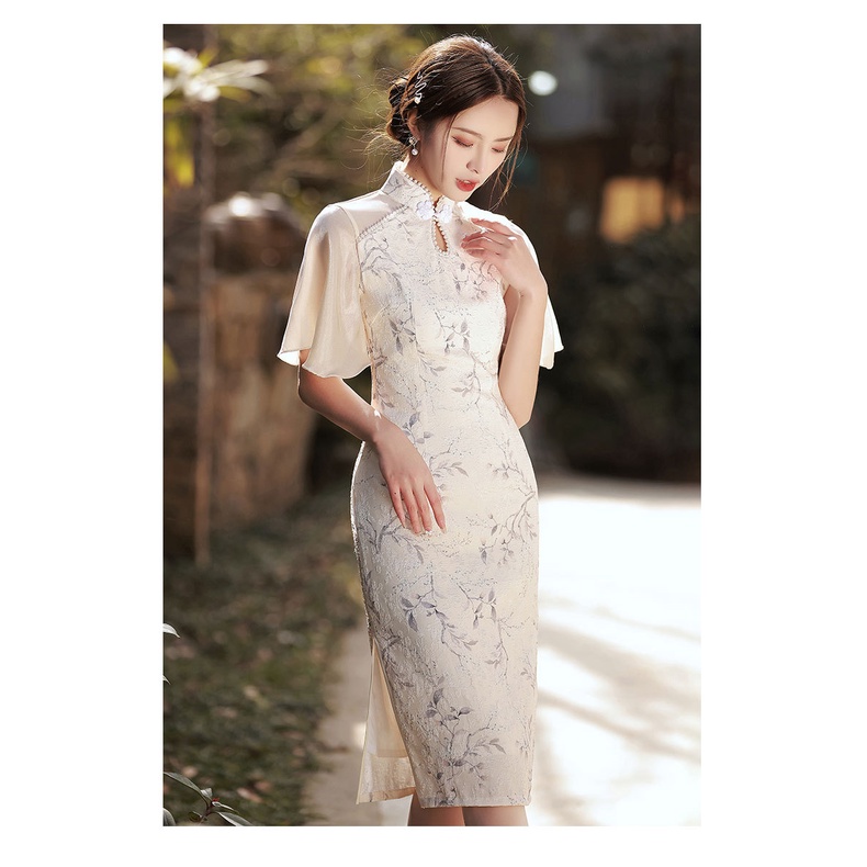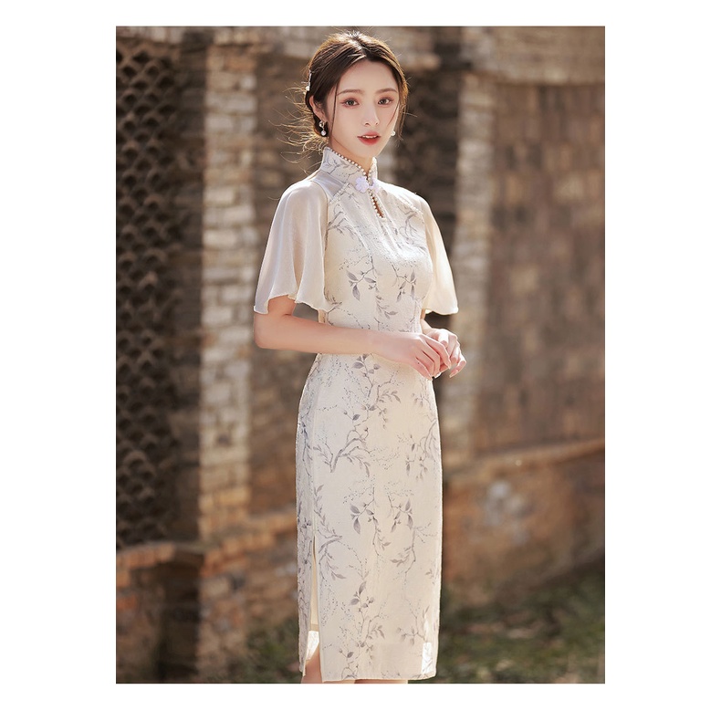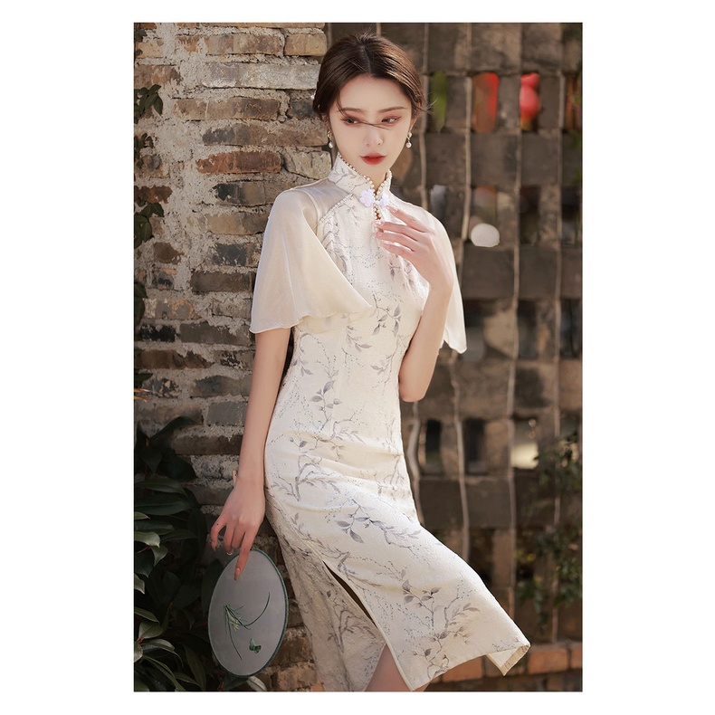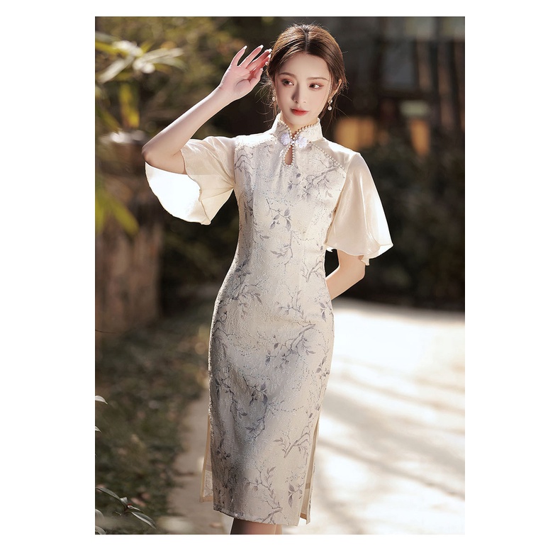 Sườn xám cách tân nữ hán phục đầm sườn xám truyền thống body tay bồng cổ đính ngọc dáng cổ điển mùa hè từ 45--70 kg