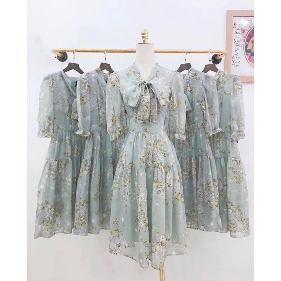 Đầm hoa thiết kế dáng xòe cổ nơ tay chun bồng lỡ chất tơ ép đẹp 139