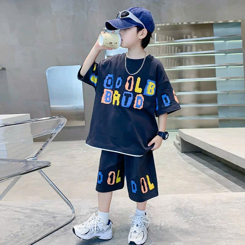 COMIMO – [20–55KG] Set Bộ Hè Cộc Tay Bé Trai – Cotton Mềm Mại, In Họa Tiết Nhiều Chữ Cá Tính, 2 Màu Đen · Trắng Kem