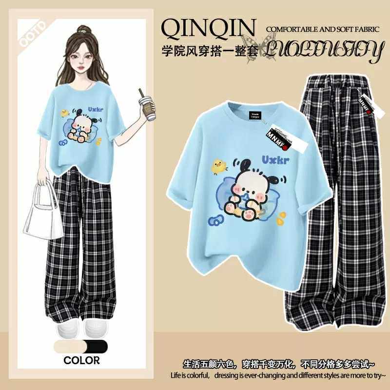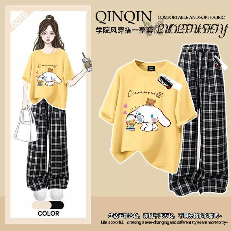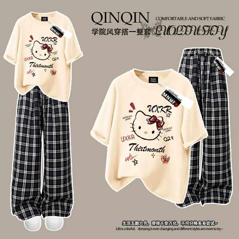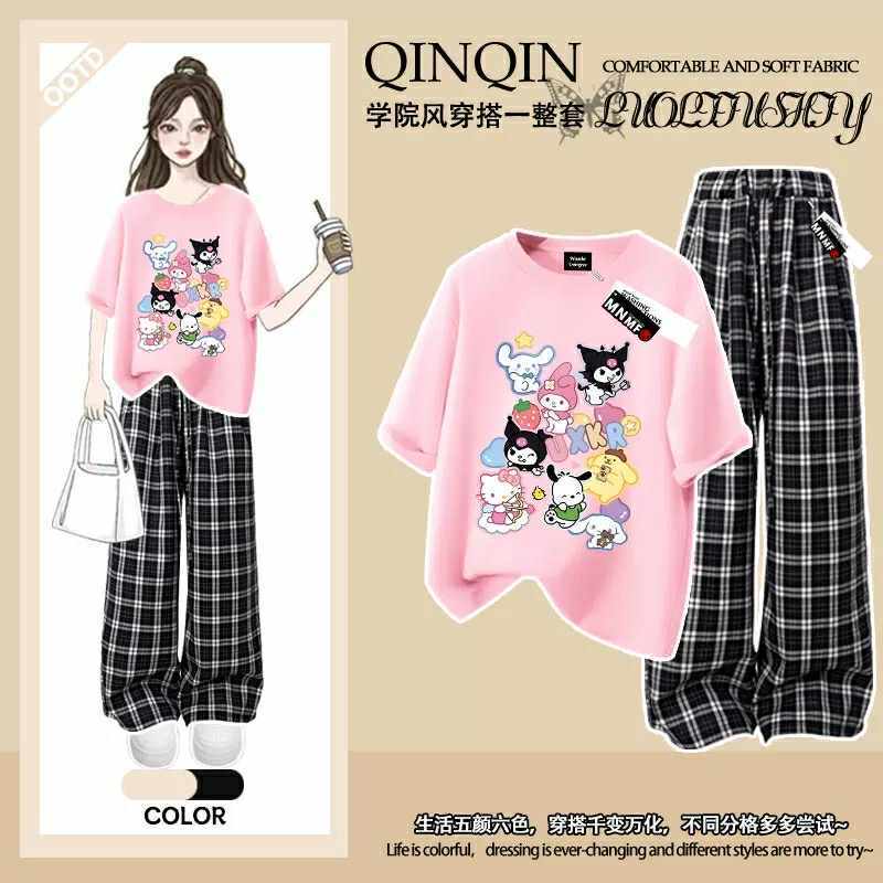 Bộ đồ mùa hè cho bé gái in hình hoạt hình Sanrio ,quần dài kẻ caro áo cộc cooton mỏng 14 - 40kg
