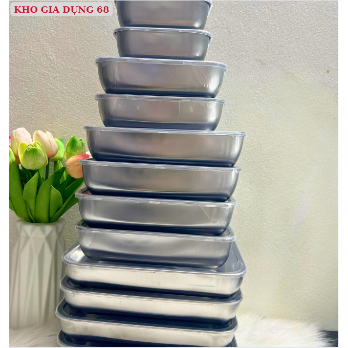COMBO 12 HỘP CHỮ NHẬT Đựng thực phẩm inox 4hộp to(25x20x6cm)+4hộp trung(22x15x6cm)+2hộp nhỡ (18x13x6cm)+2hộp(13x10x6cm)