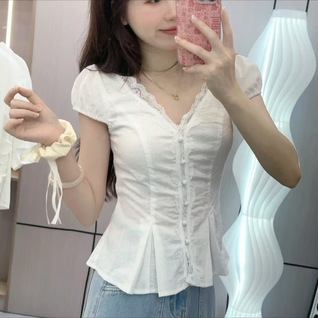 Áo sơ mi nữ ren tay ngắn cổ V khoét eo thắt dây phong cách Hàn Quốc mùa hè