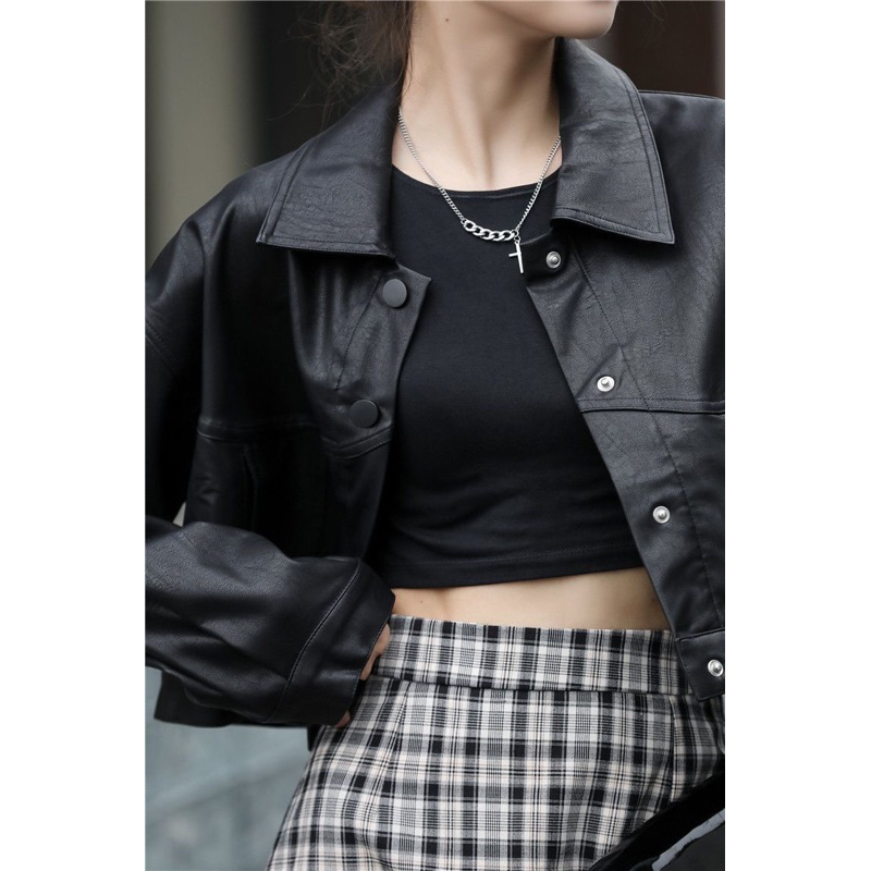 (Hỏa tốc) Áo khoác da 2 lớp croptop basic cúc bấm 1 hàng phong cách Retro Chut.Room dành cho nữ