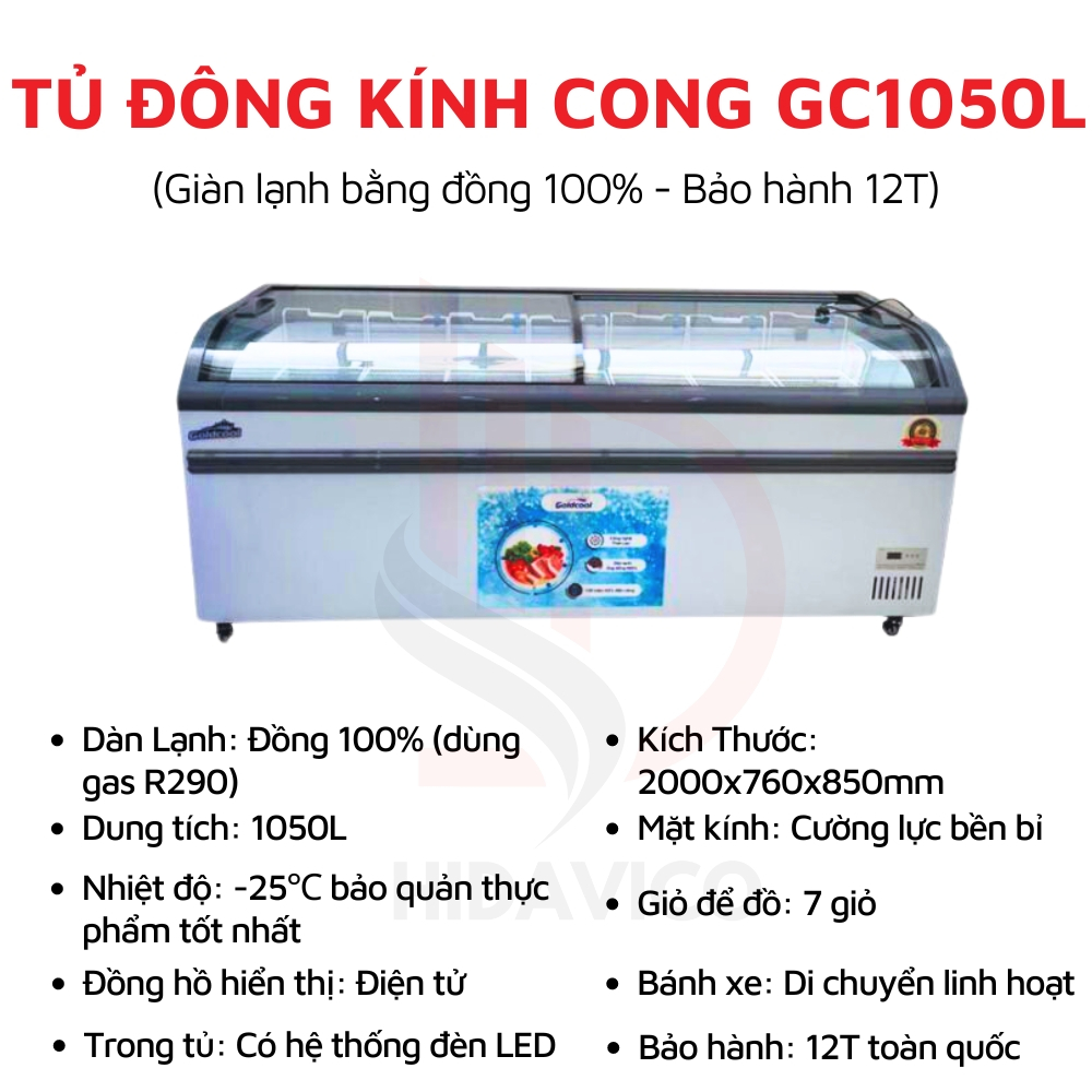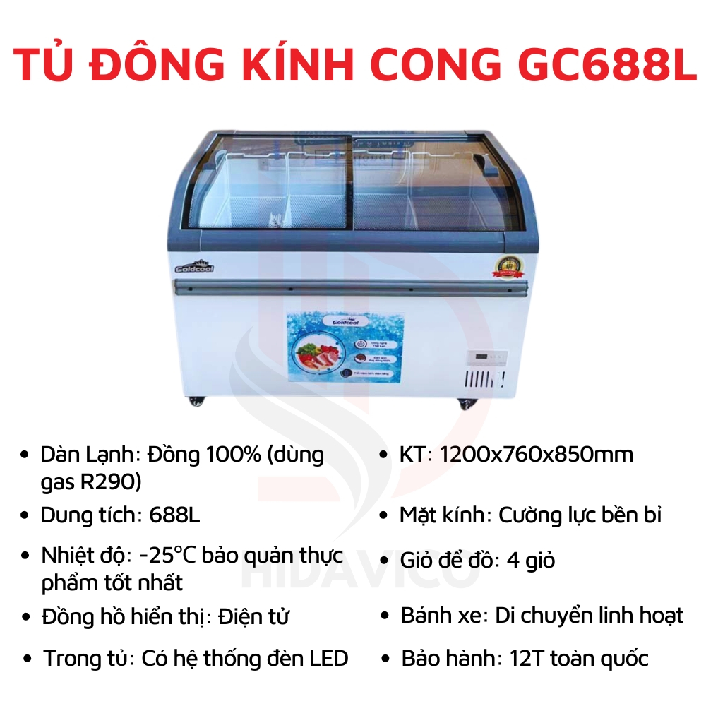 Tủ Đông Mặt Kính Hidavico GoldCool, Tủ Kem Đông Lạnh Kính Cong Dạng Lùa Ít Đóng Tuyết