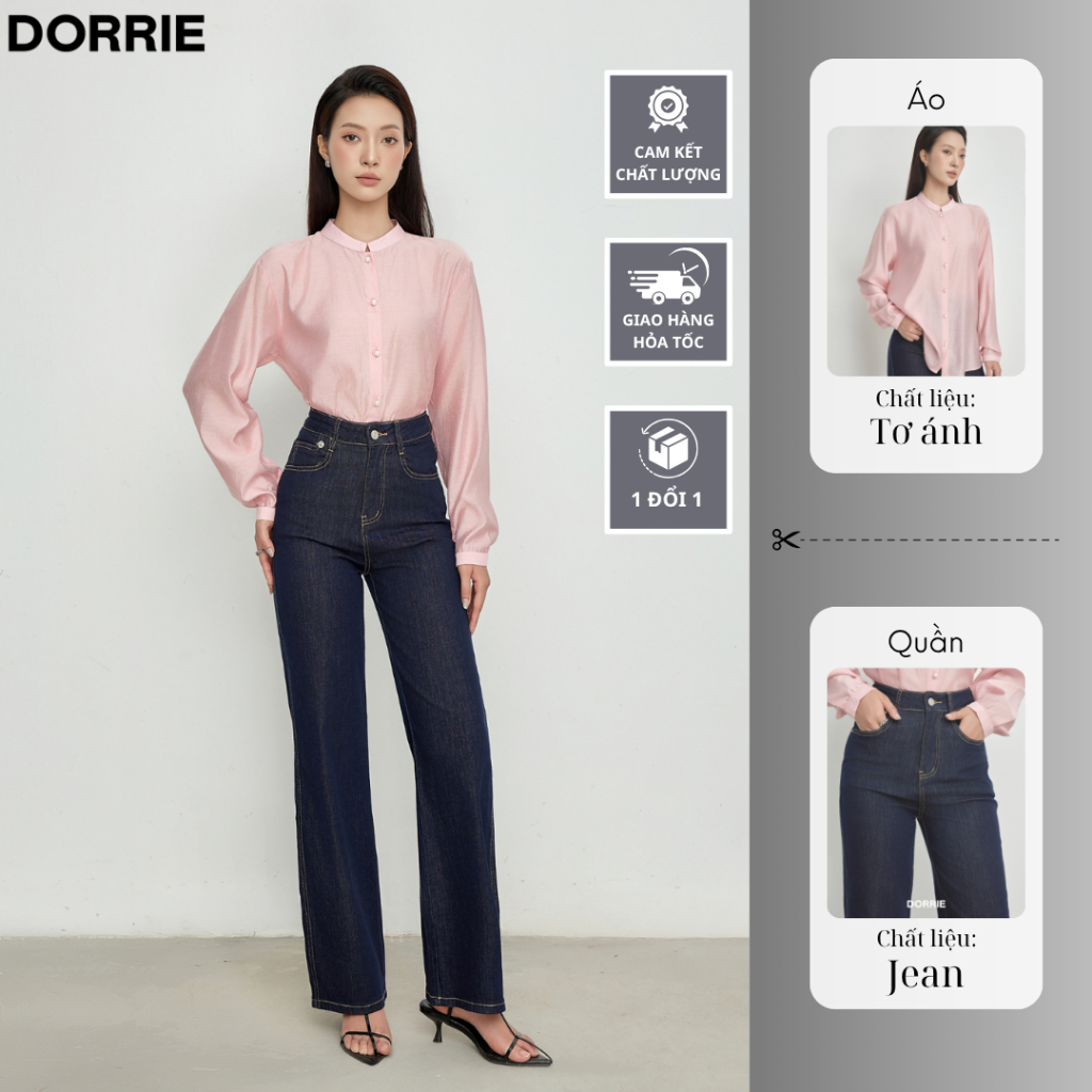Set Naori Áo Tơ Ánh Tay Dài Cổ Trụ + Quần Denim Cạp Cao – Gọn Gàng, Tinh Tế, Tôn Dáng Thanh Thoát