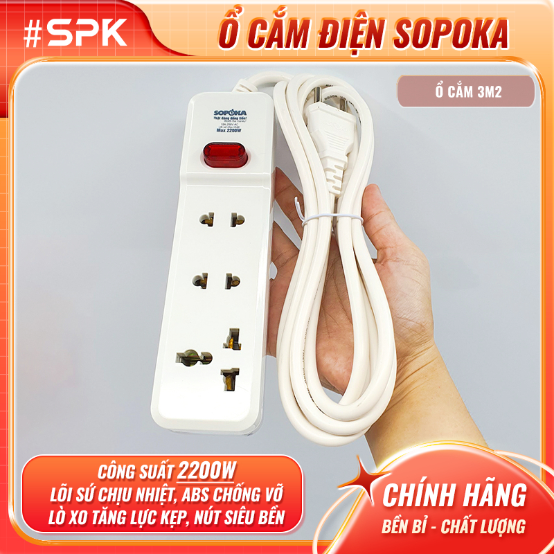 SOPOKA Ổ Cắm Điện 3 Lỗ 2200W Lõi Sứ Có Dây 3M2 Công Tắc ON/OFF Siêu Bền Bỉ An Toàn Tiện Lợi