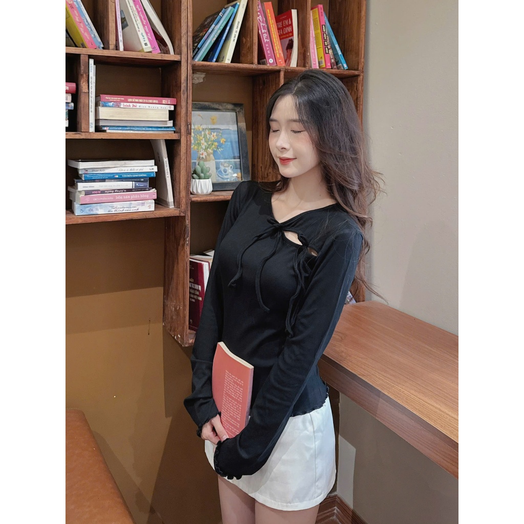 Áo kiểu tay dài nữ buộc nơ xinh xắn chất cotton thun co giãn form ôm tôn dáng AOT063