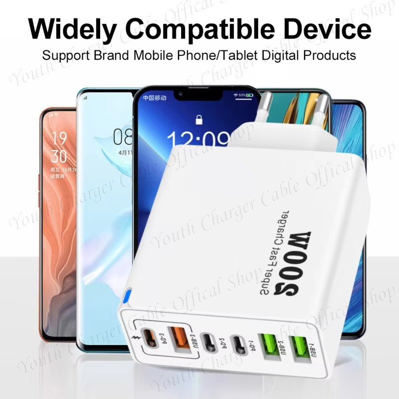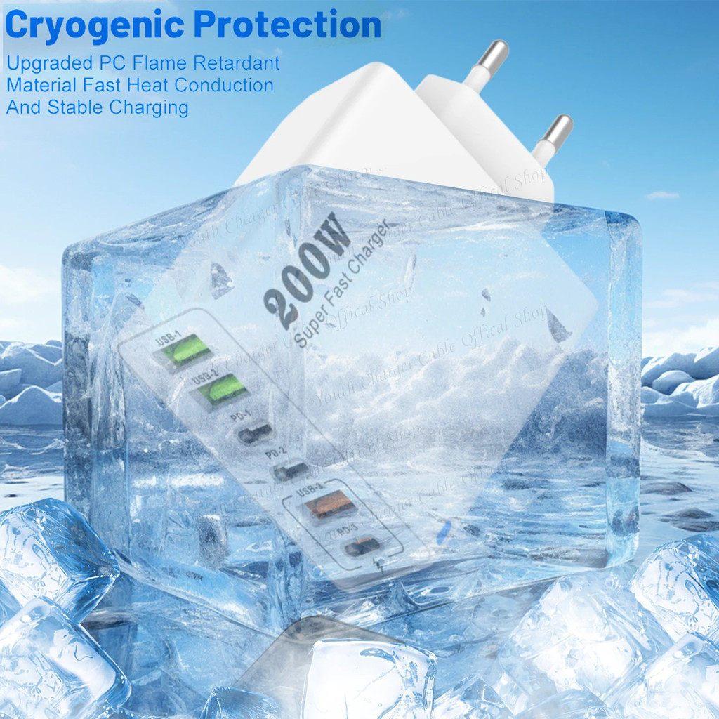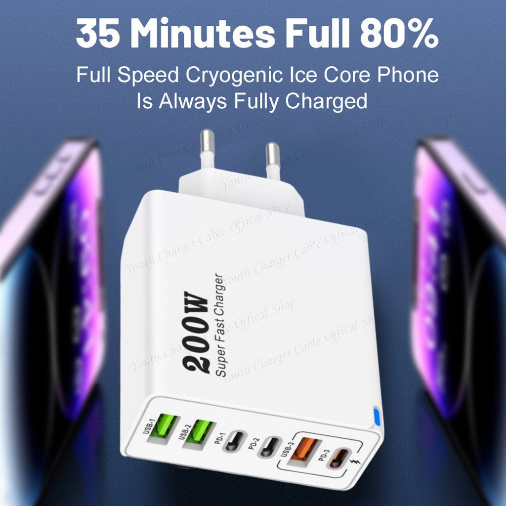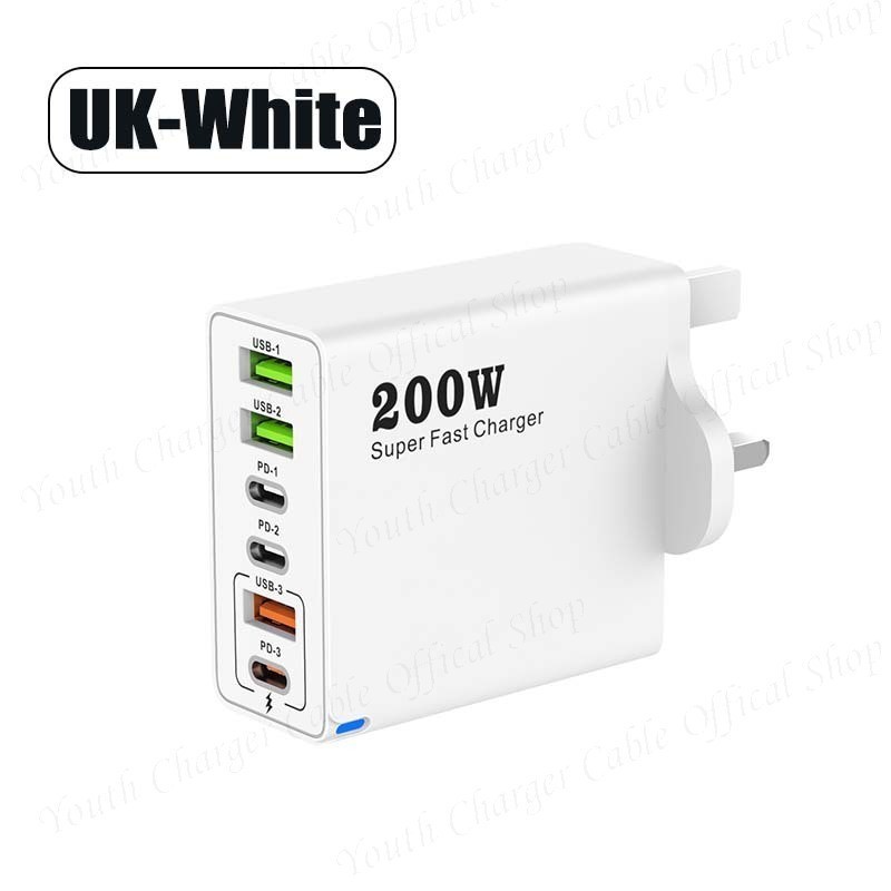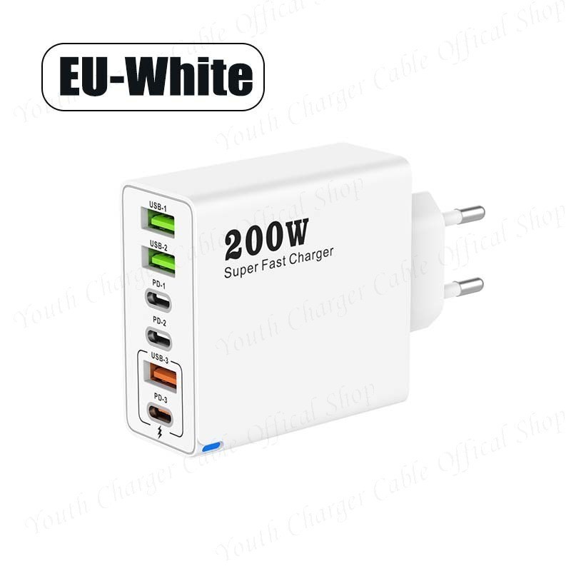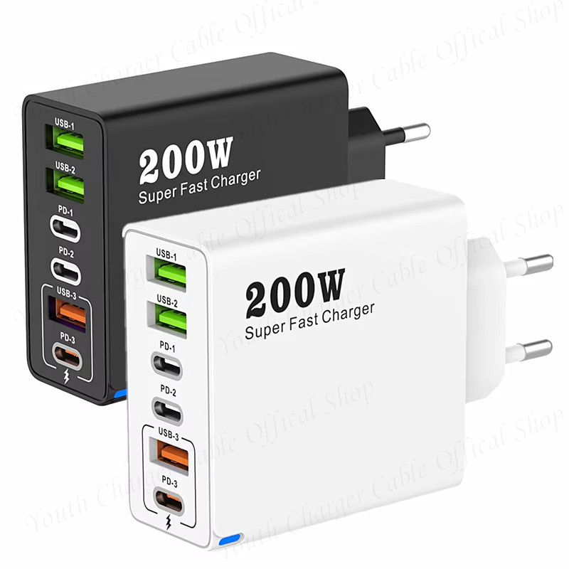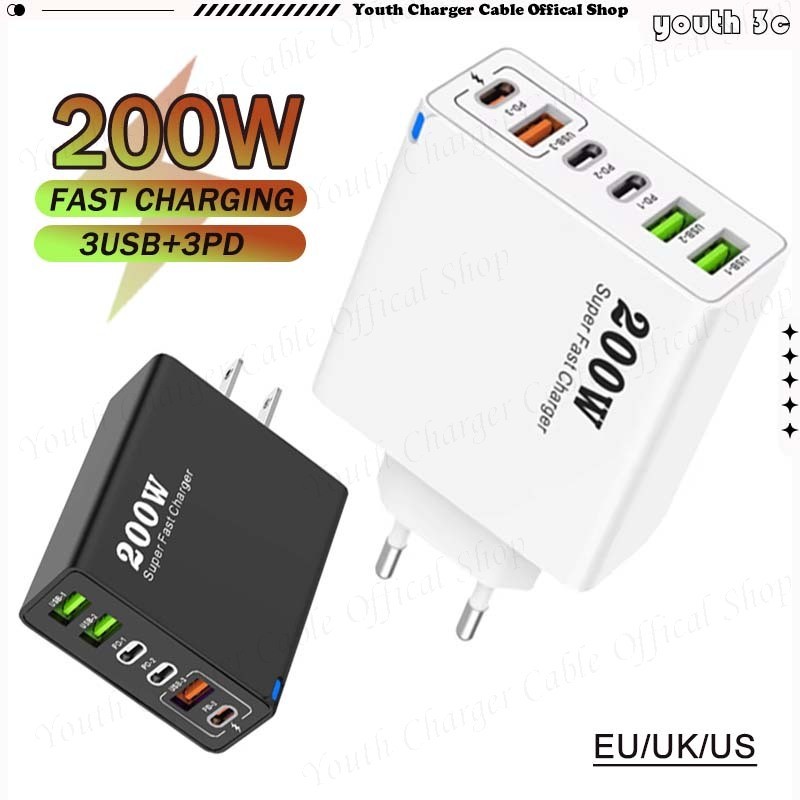 Bộ sạc siêu nhanh 200W 3USB + 3Type C Bộ sạc điện thoại Bộ chuyển đổi sạc tường QC3.0 du lịch đa năng