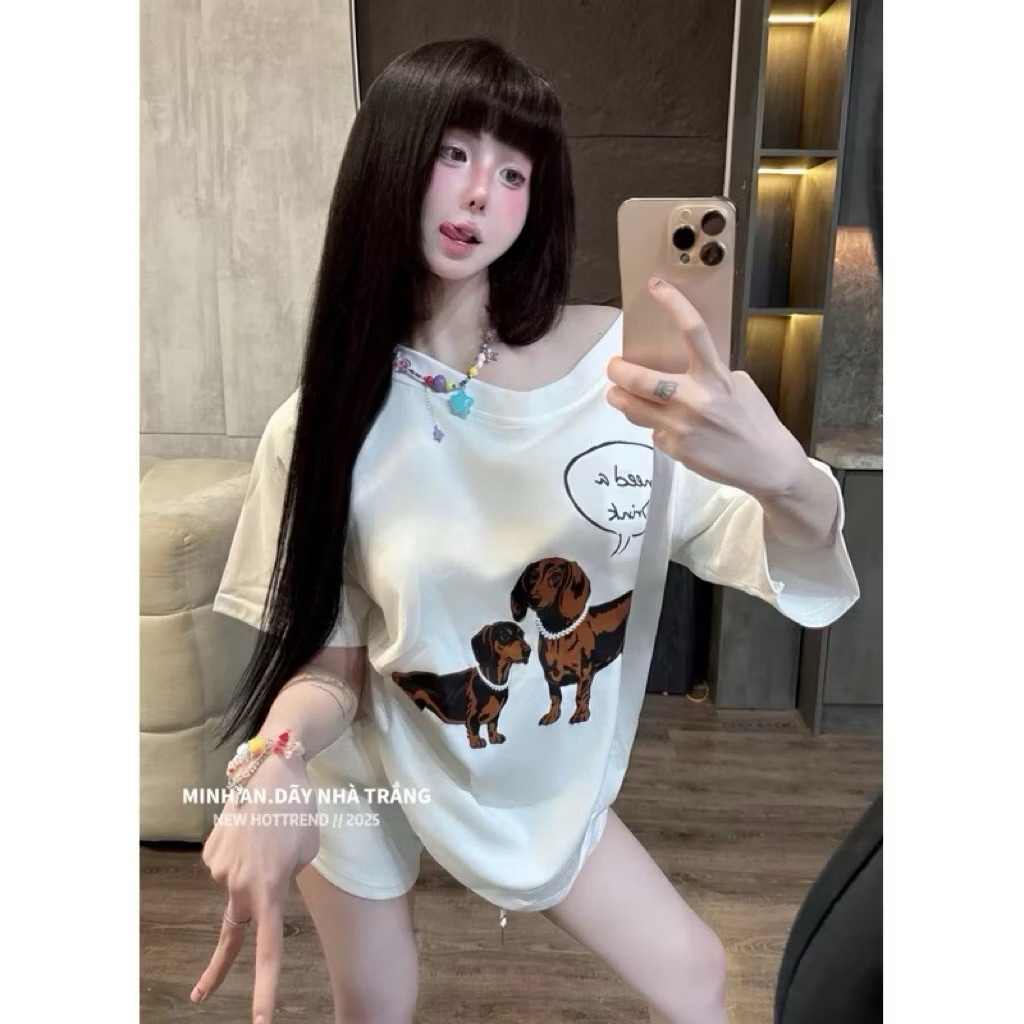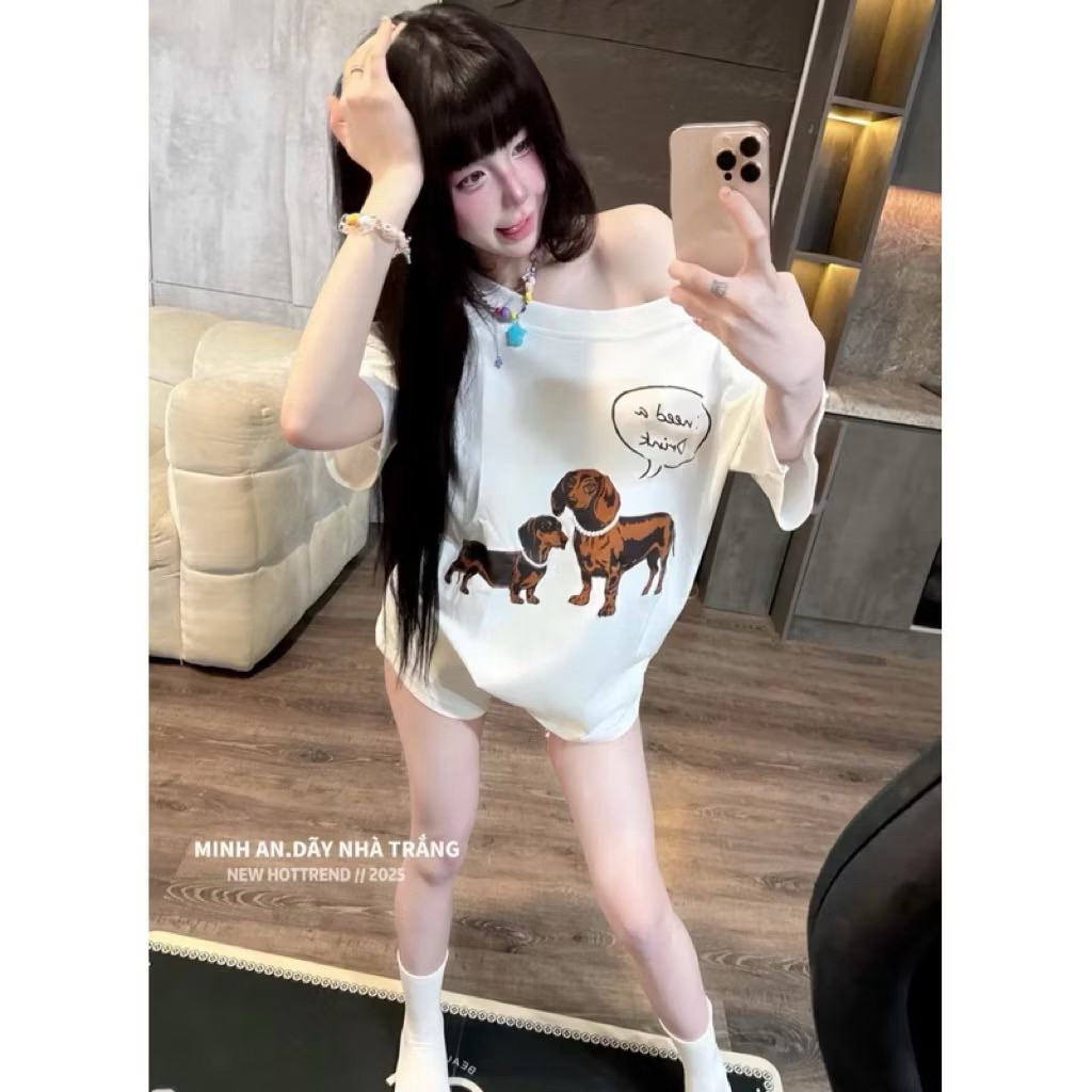 Áo lệch vai hình cún siêu xinh dễ mix đồ, Áo thun dễ thương mặc mùa hè