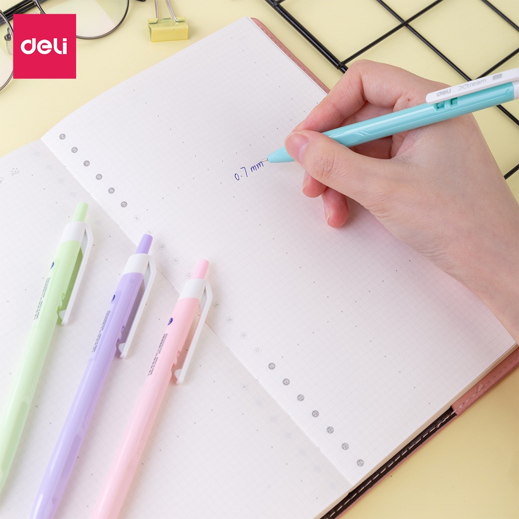 Hộp 12 Chiếc Bút Bi Bấm Deli Học Sinh Văn Phòng Mực Xanh Viết Đều Trơn Tru Không Tắc Mực Nhanh Khô
