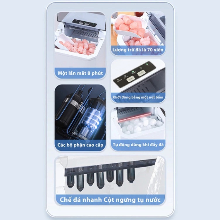 Máy Làm Đá Viên Siêu Tốc 6 Phút Công Suất Lớn Tiết Kiệm Điện Giữ Lạnh 8h - Tủ Làm Đá Mini Làm Đá Nhanh