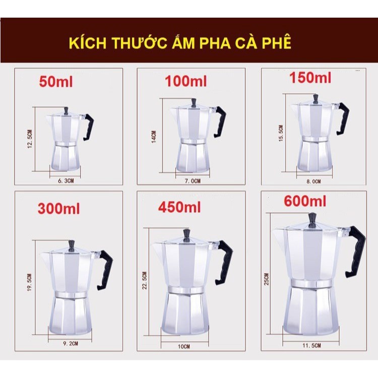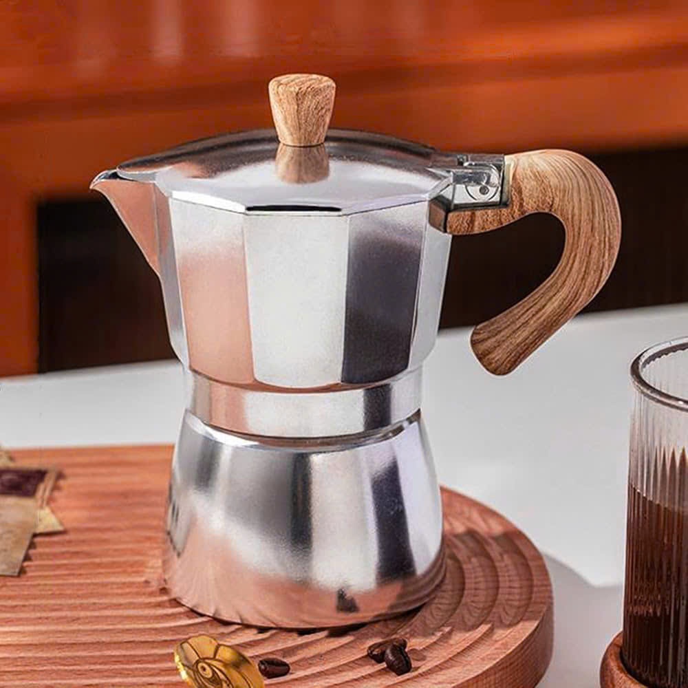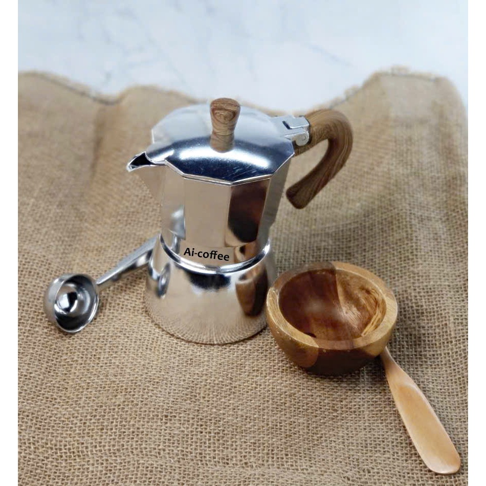 CAO CẤP . Ấm pha cà phê MOKA POT kiểu Ý thẩm thấu ngược . Hợp kim nhôm . Tay cầm gỗ . MẦU NHÔM .