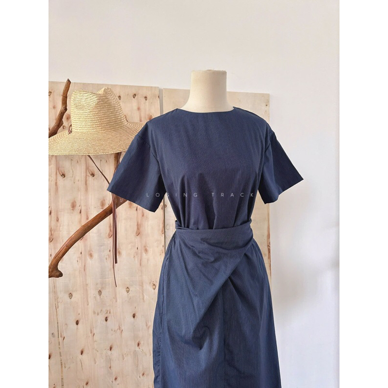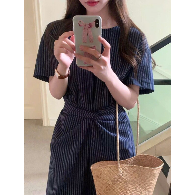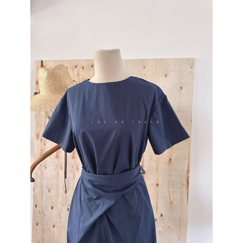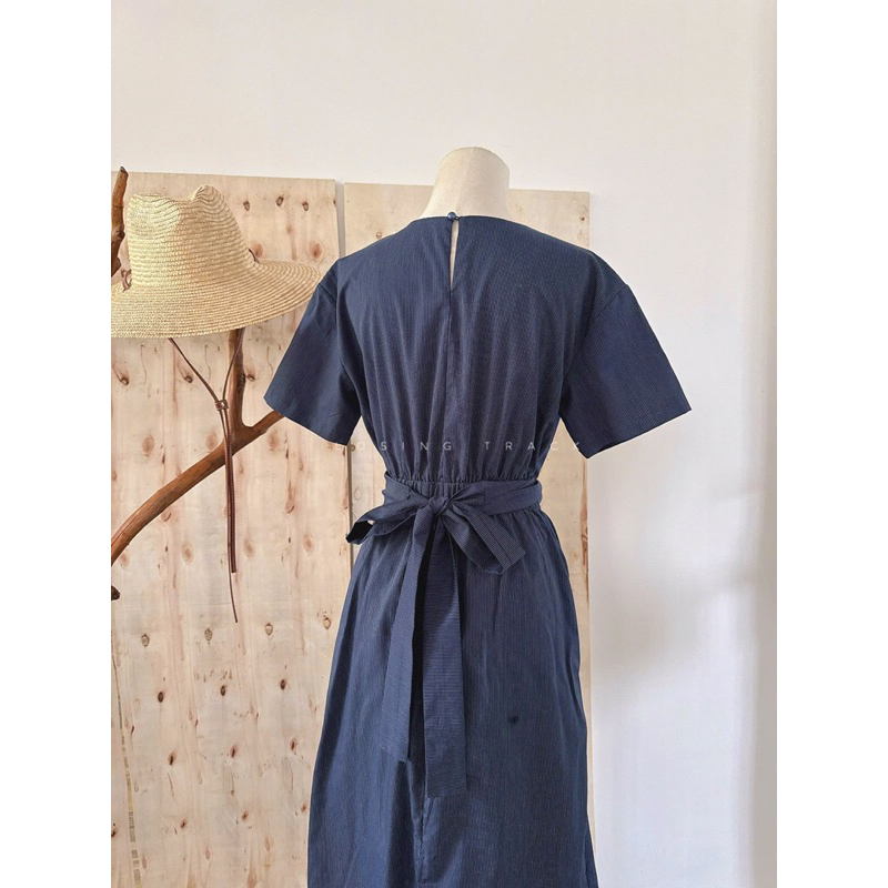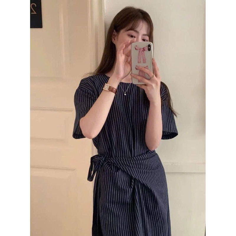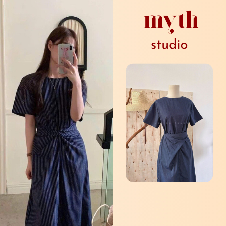 Đầm sọc xanh navy cổ tròn bo eo dáng dài midi công sở Mythstudio