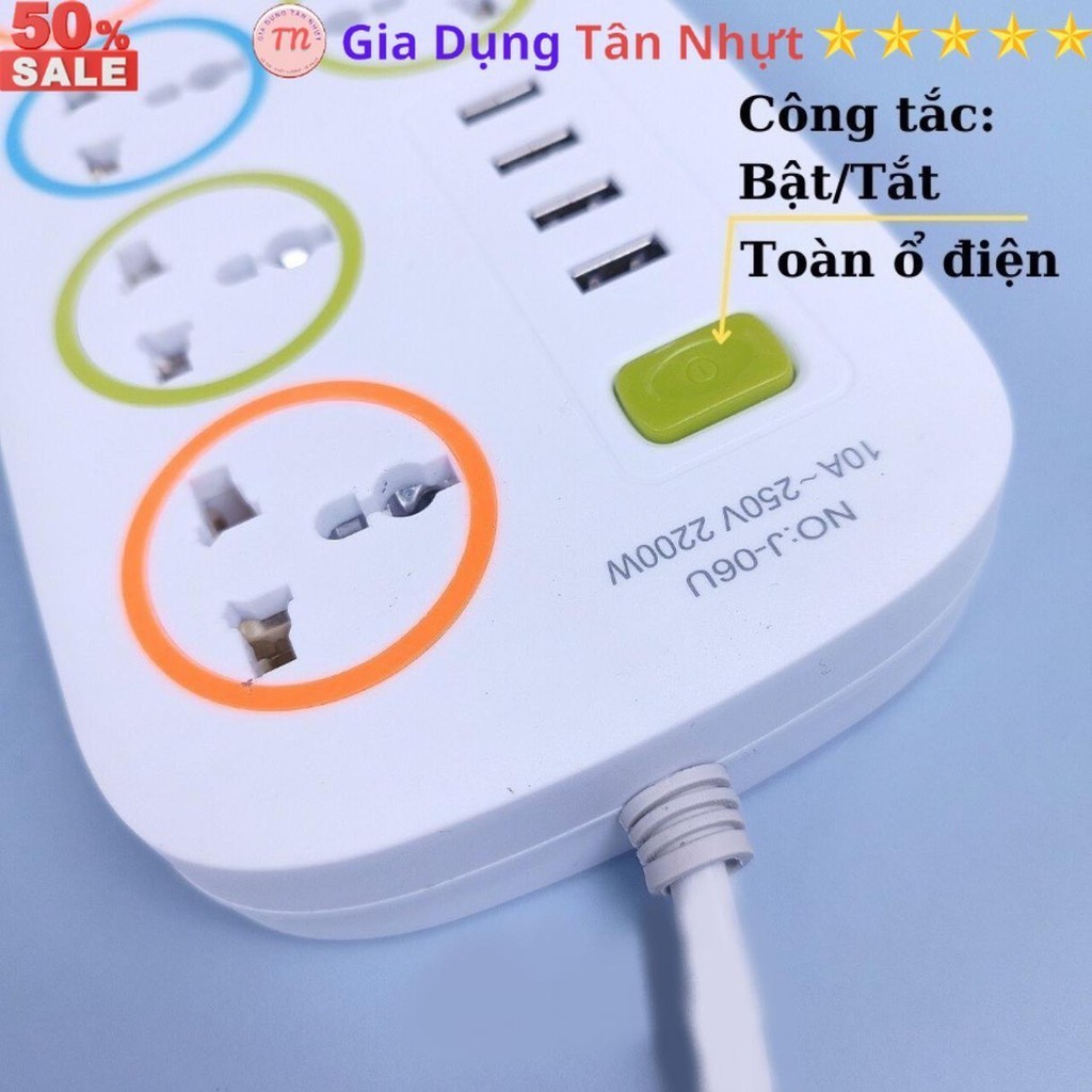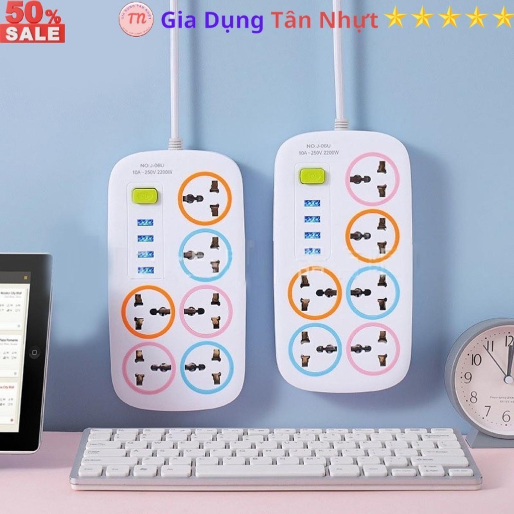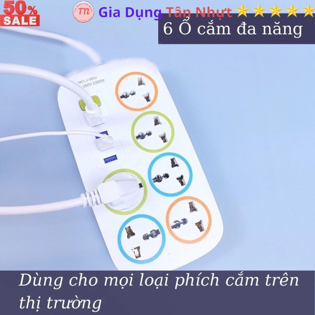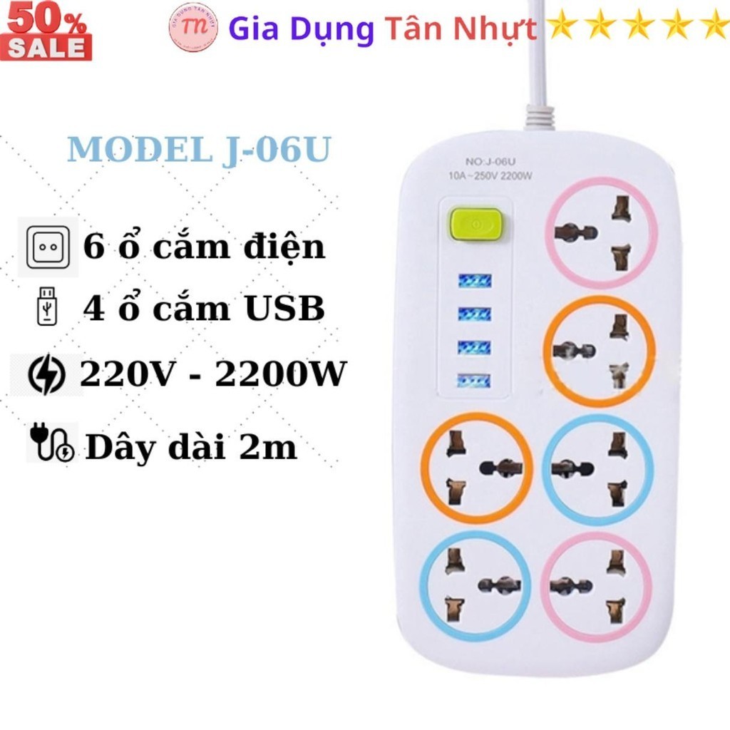SKU31 - Ổ cắm điện đa năng J06U, ổ điện 6 lỗ cắm, 4 cổng USB 5v 2A sạc điện thoại, dây dài 1 métp