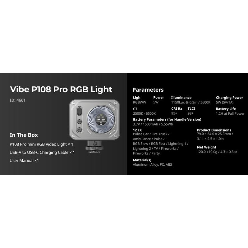 Đèn Video SmallRig Vibe P108 Pro RGB, Đèn Camera Led di động để chụp ảnh, Đèn đế lạnh, CRI95 +, 2500-6500K, 12 hiệu ứng, Phụ kiện đèn lấp đầy cho người tạo nội dung, Stre