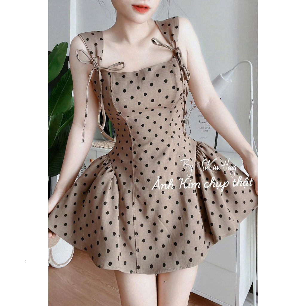 Đầm mini thời trang Nữ xu hướng mới chất mango 2 dây bảng to đính nơ chiết eo váy xòe dễ thương in họa tiết chấm bi Shop
