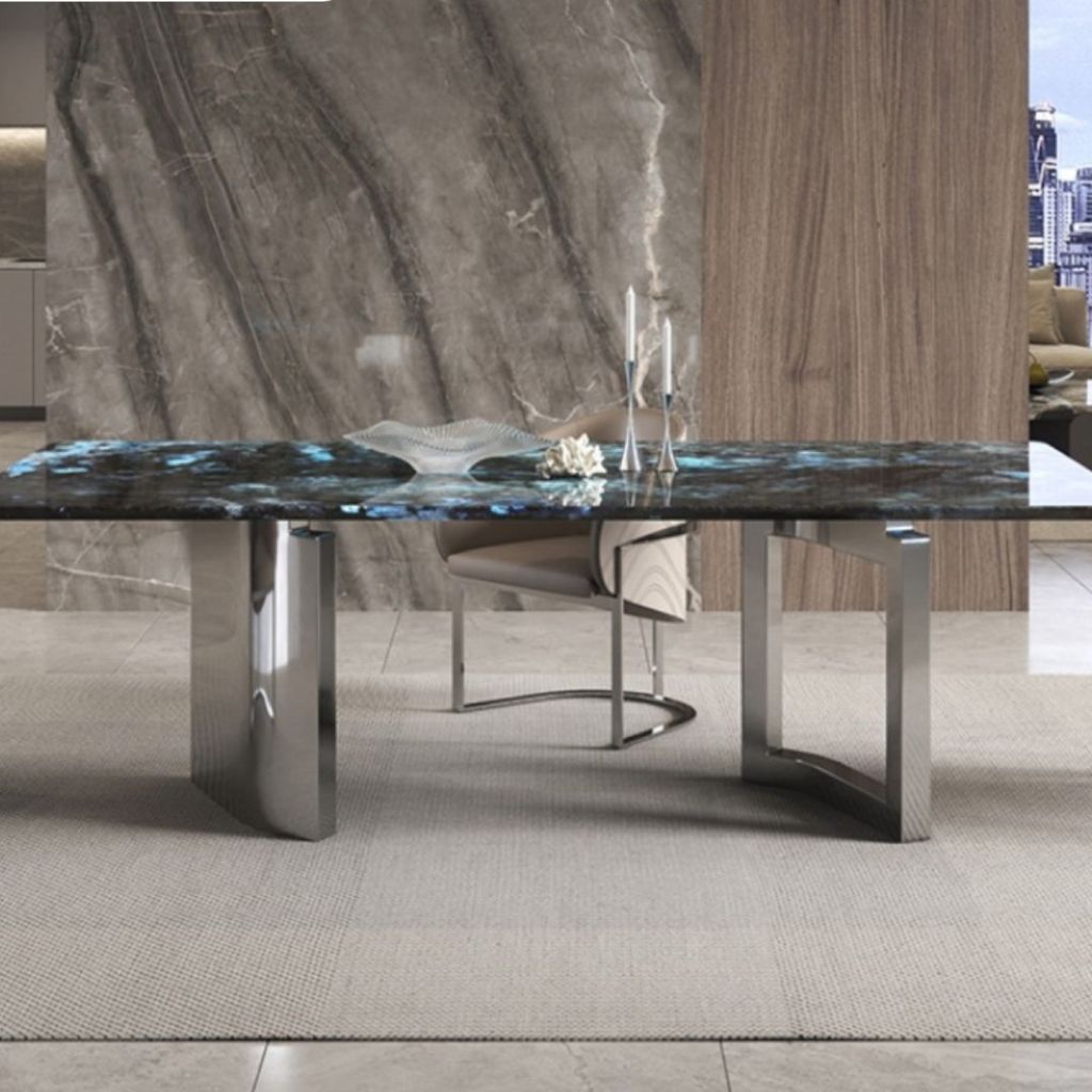 Bàn Ăn Phong Cách Ý, Bàn Ăn Hình Chữ Nhật Thép Không Gỉ, Bàn Ăn Mặt Đá Ceramic 2 Chân Trụ