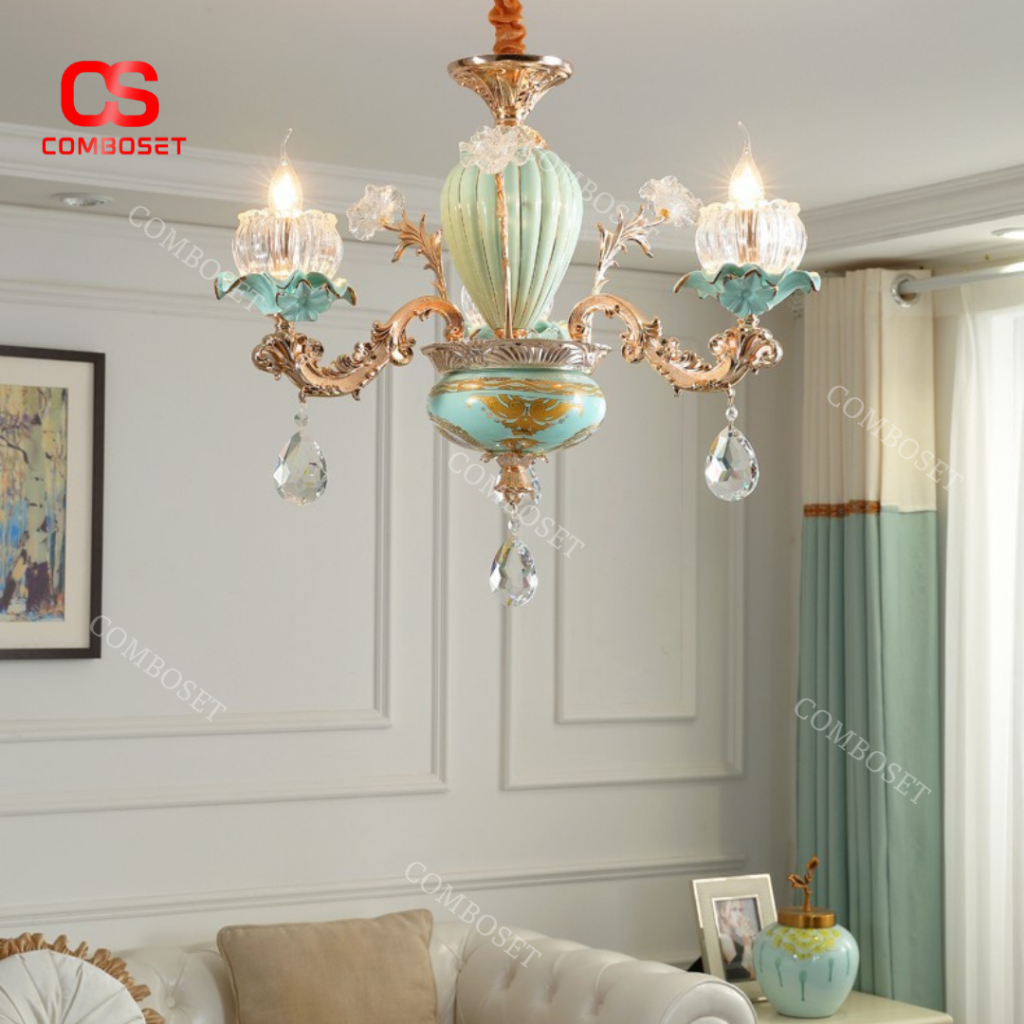 Đèn Chùm Pha Lê Nến Gốm Sứ Xanh Ngọc Hoàng Gia Cho Biệt Thự Phòng Khách, Phòng Ăn