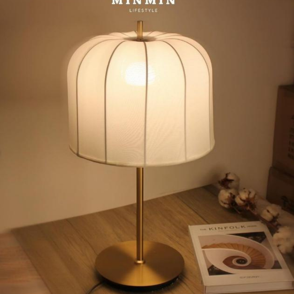Đèn Bàn Chao Vải Đế Sắt Mạ Vàng Chóp Nón Dùng Trong Phòng Khách Phòng Ngủ