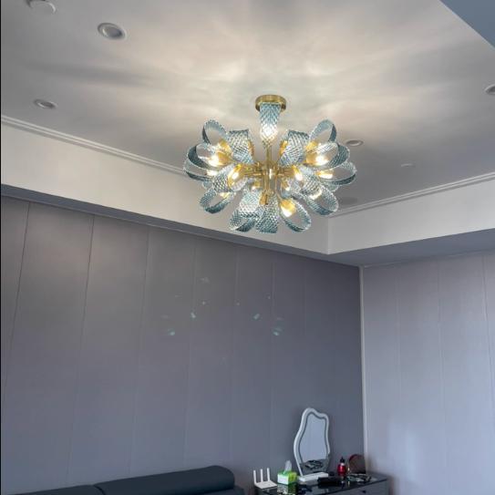 Đèn Chùm Thủy Tinh Xanh Dương Khung Kim Loại Mạ Vàng Thiết Kế Hoa Nghệ Thuật Hiện Đại