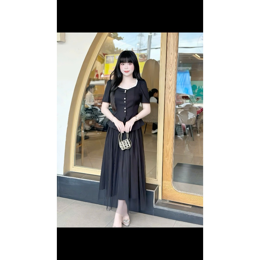 B23 - Set thiết kế tiểu thư dành cho Nữ, Áo viền ren đính nút mix Chân váy 2 lớp