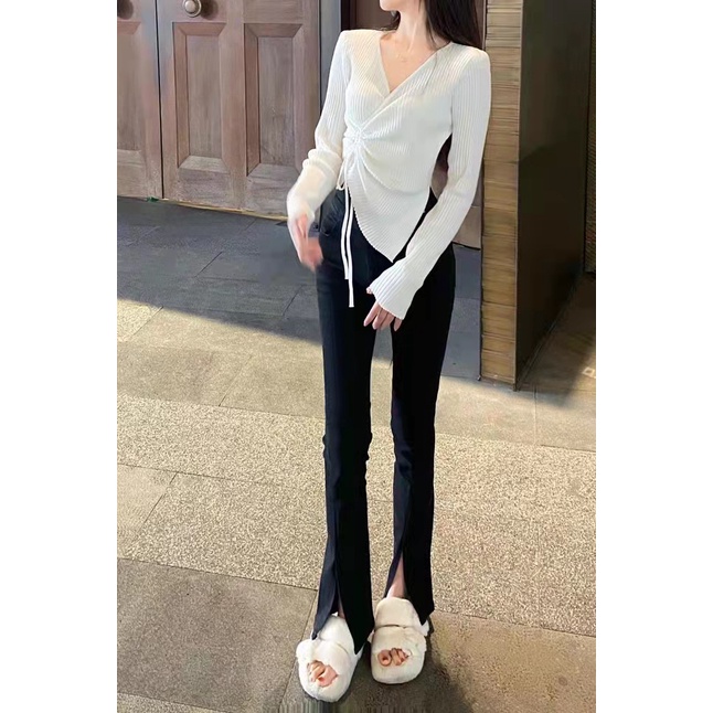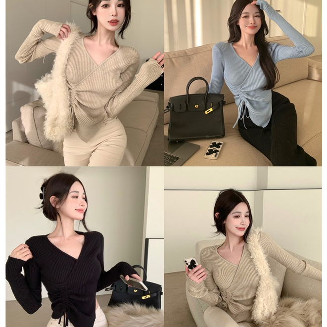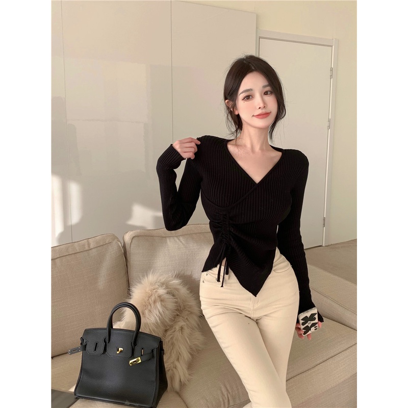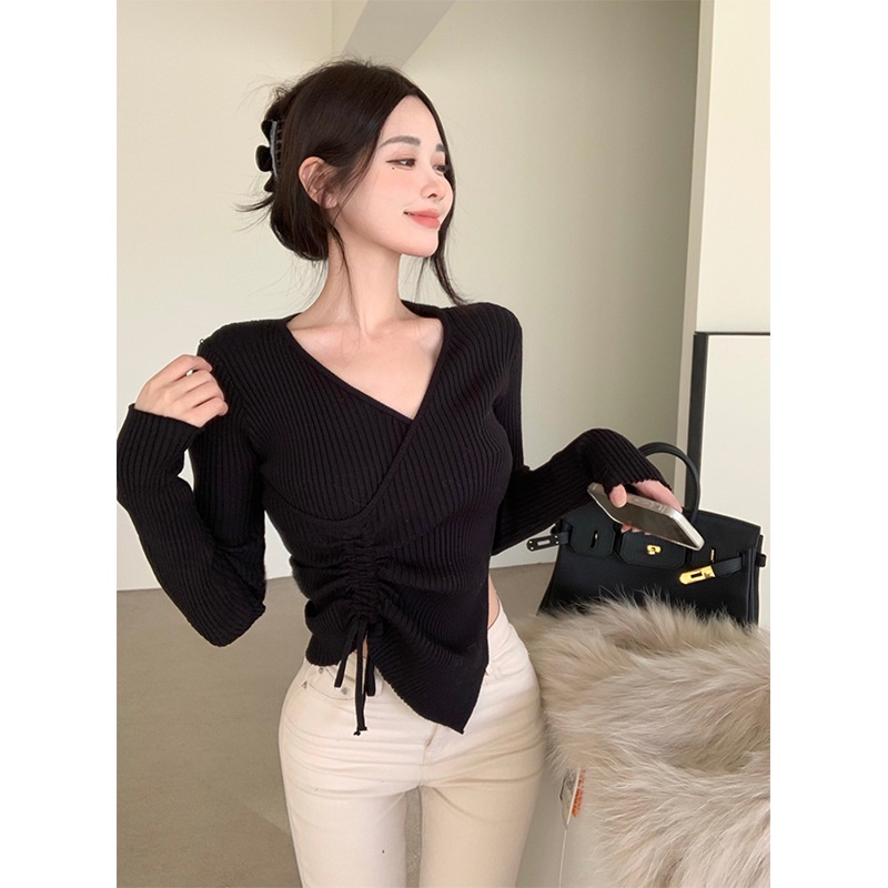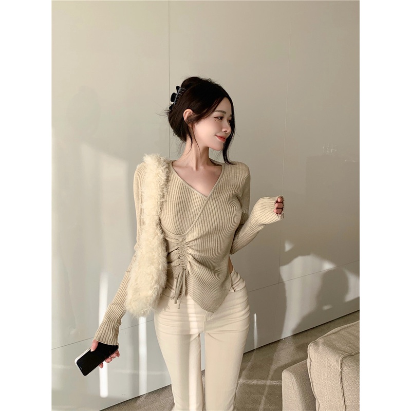 Áo len nữ dài tay cổ chữ V áo len nữ dây rút chiết eo len body DOLPHIN hàng quảng châu M25 C2-17
