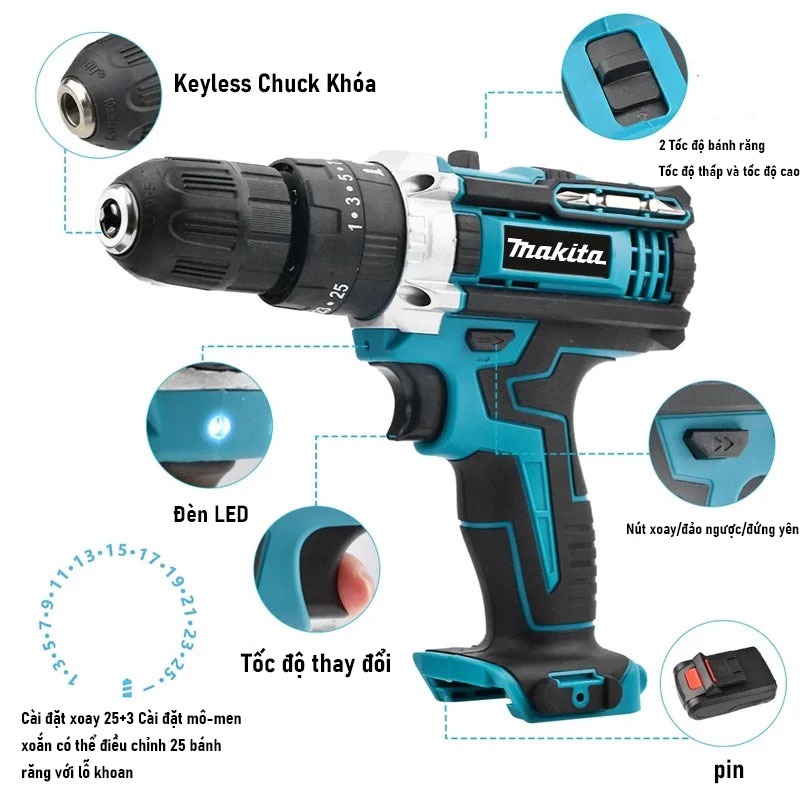 Makita Máy khoan Pin 1280VF, đầu kẹp 10mm, động cơ không chổi than, tặng kèm phụ kiện 29 chi tiết
