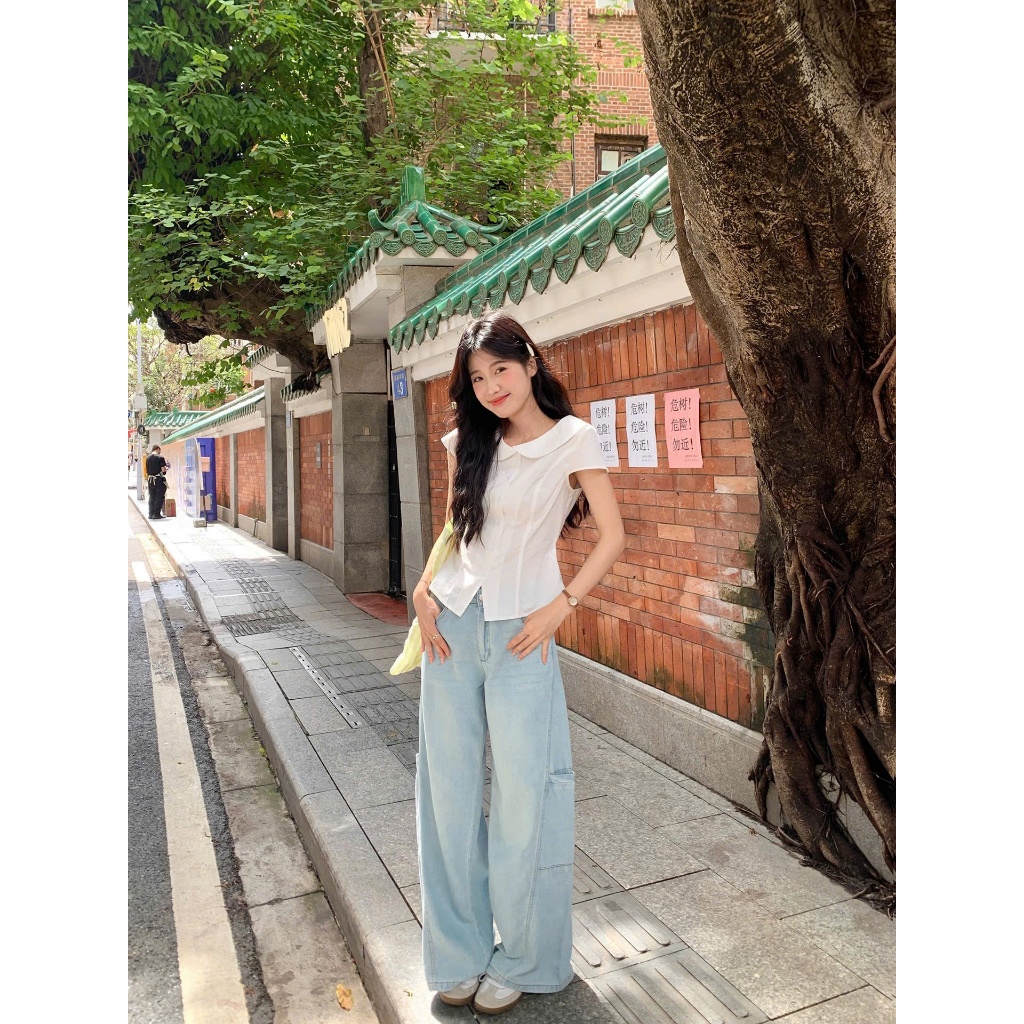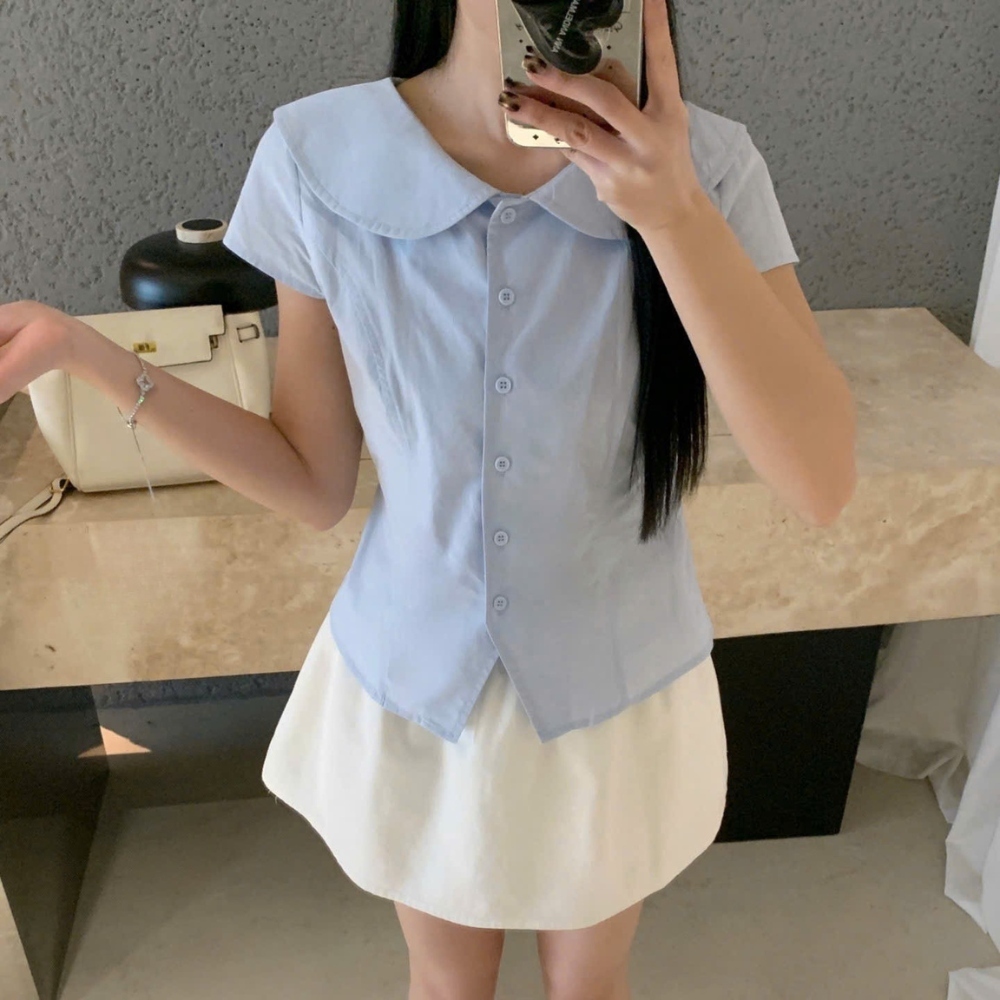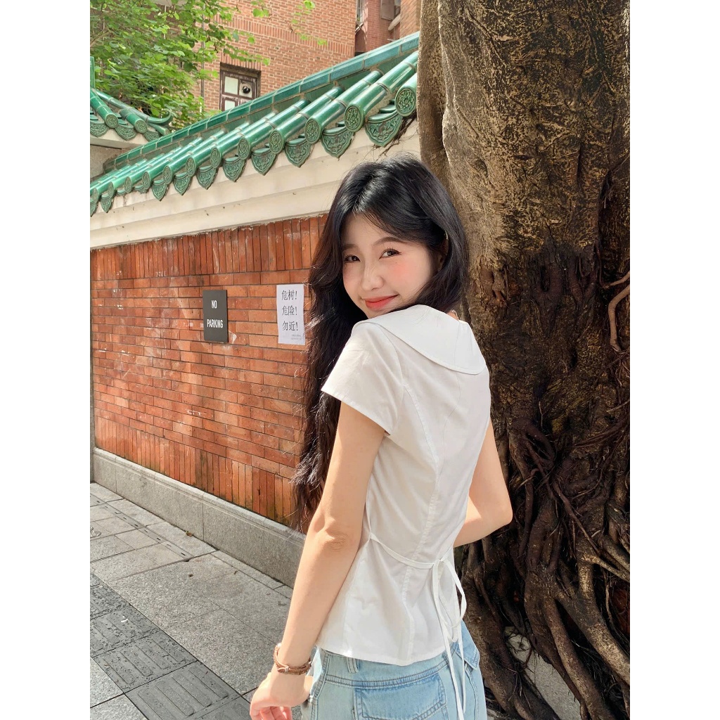 [ Sẵn Trắng , Xanh]Áo Sơ Mi Nữ Cổ Sen Vintage Tay Ngắn Thanh Lịch Áo Sơ Mi Nữ Hàn Quốc Dáng Ôm Nhẹ Nữ Tính Đi Học Đi Làm
