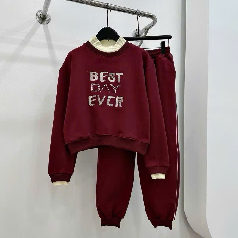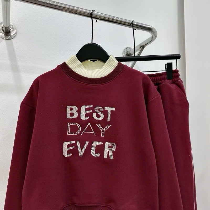Set Bộ Nỉ HCOM3681 - Áo sweater cổ cao ống tay phối len, thêu chữ, quần suông gấu bo này đỏ đô - Jemmyy Style